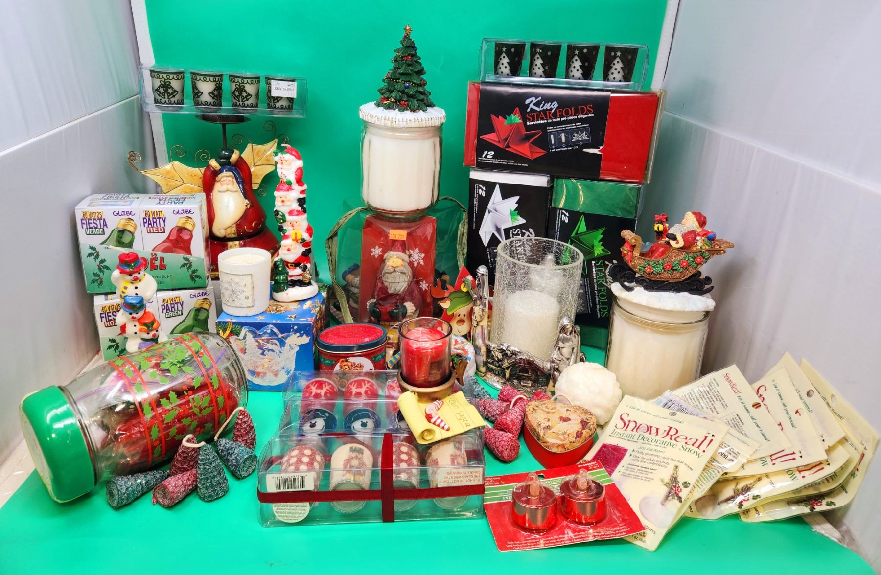 Christmas Decor Lot w/ Artificial Snow, Starfold Napkins, Candles, & More