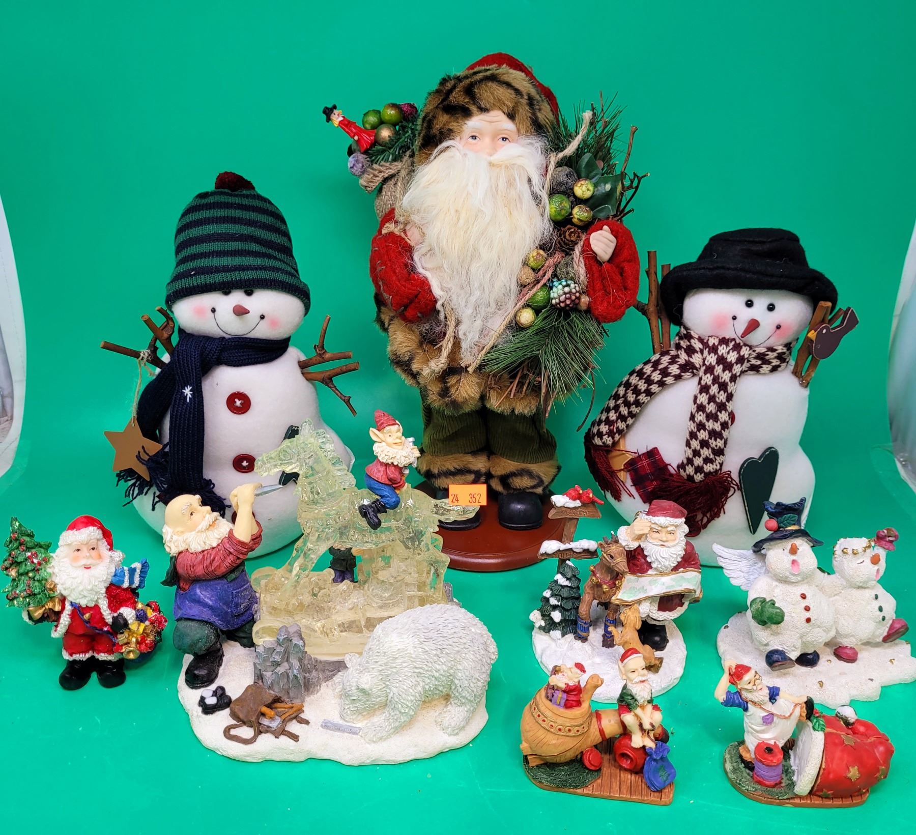 Christmas Decor Lot w/ Assorted Figurines, Plush Snowmen Decorations, & More