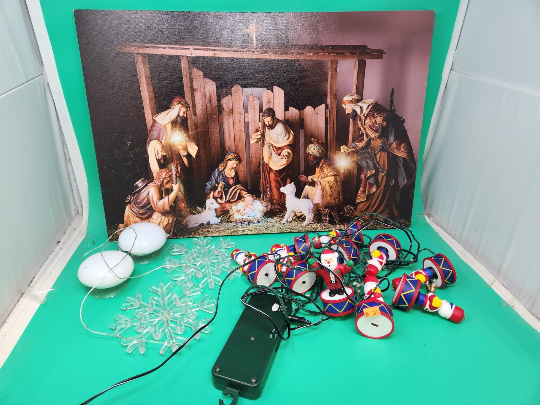 Christmas Decor Lot w/ Drum String Lights, Nativity Scene on Canvas, & More