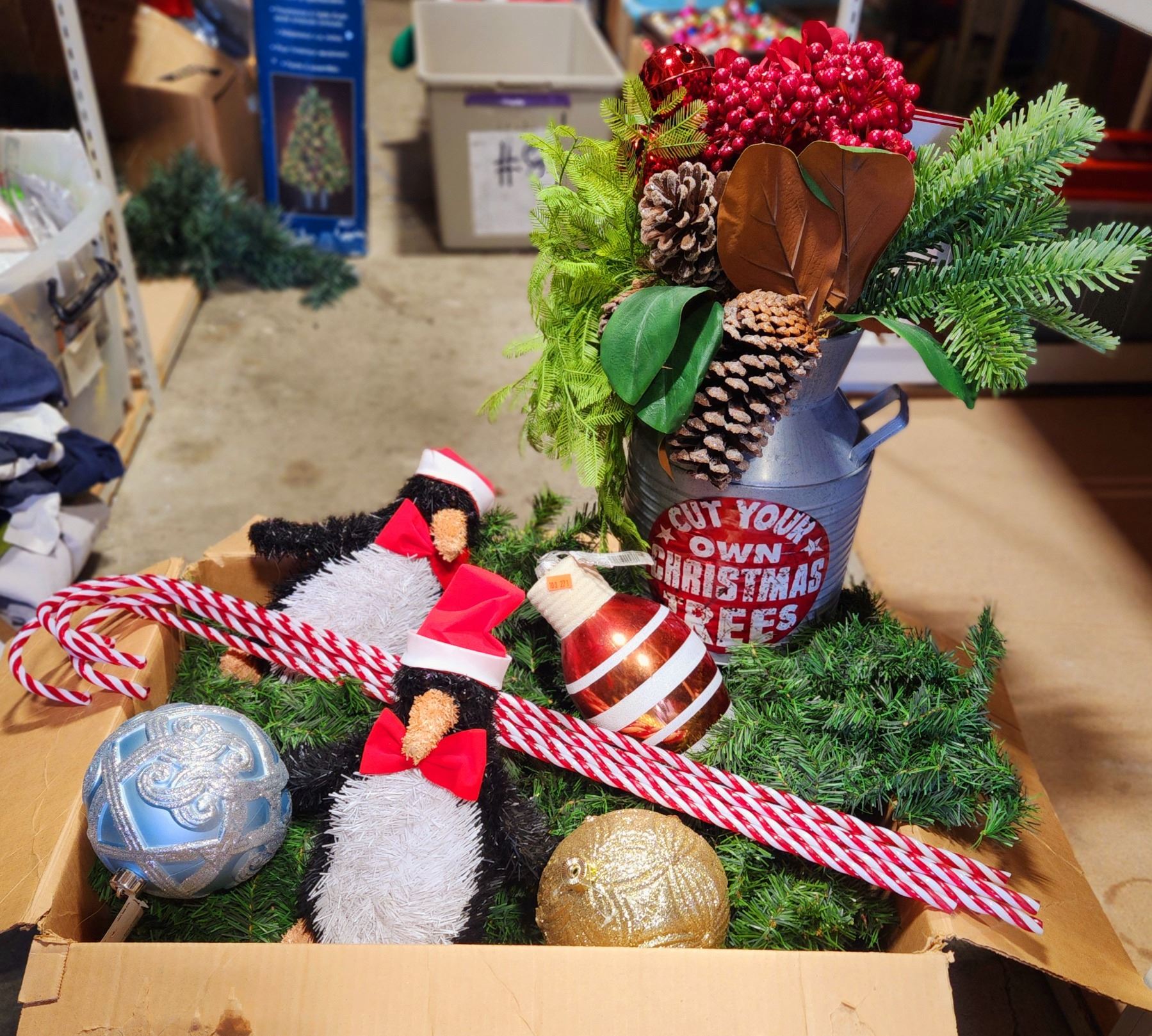 Christmas Decor Lot w/ Large Cut Your Own Tree Decor, Large Ornaments, Penguins, & More