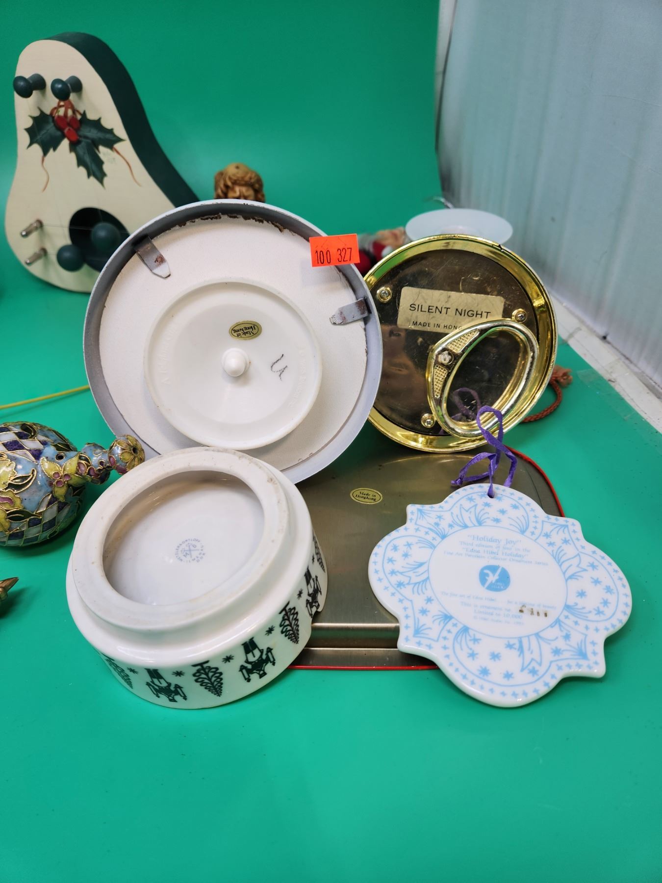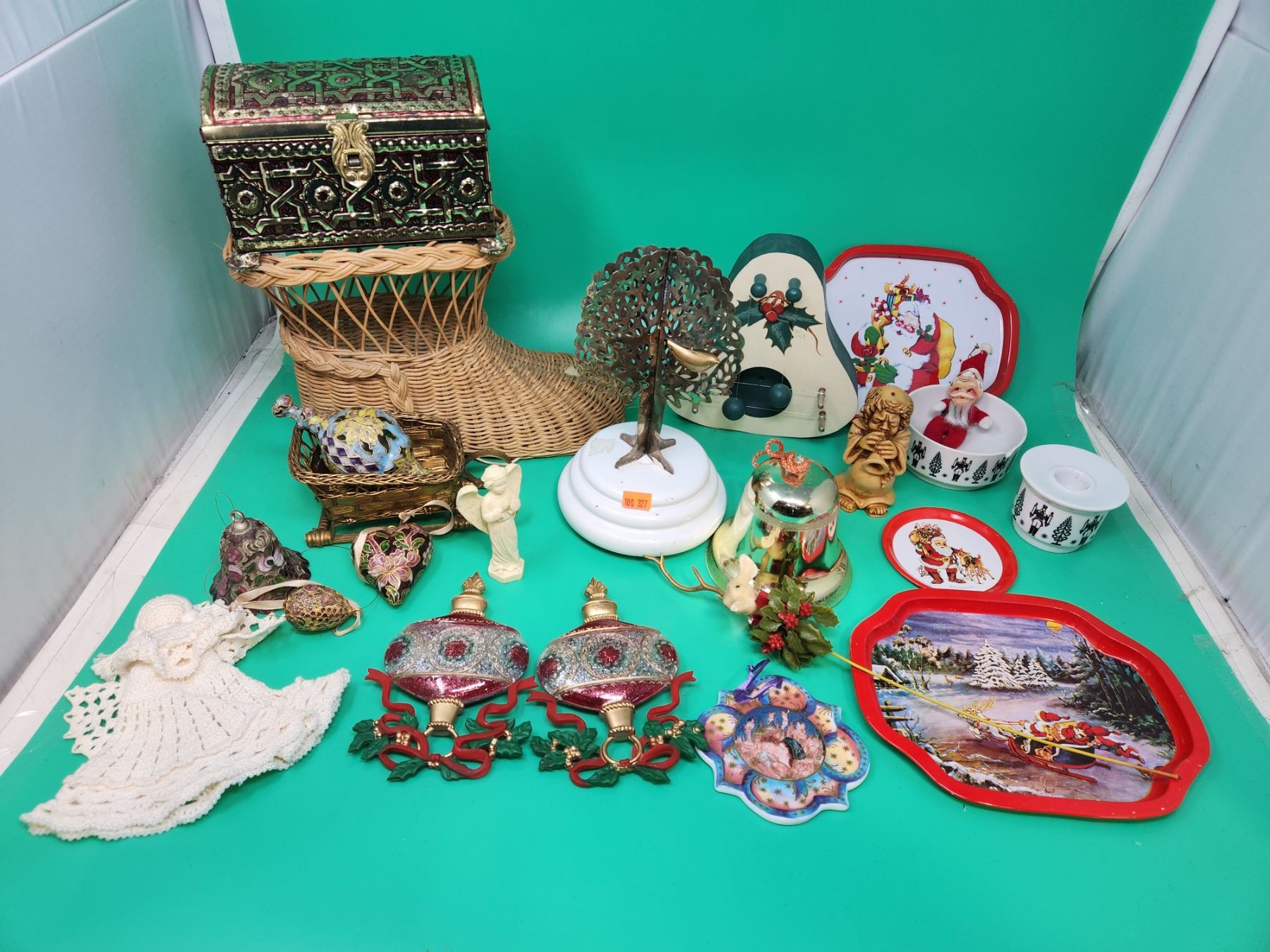 Christmas Decor Lot w/ Ornaments, Serving Trays, Santa Boot Basket, & More