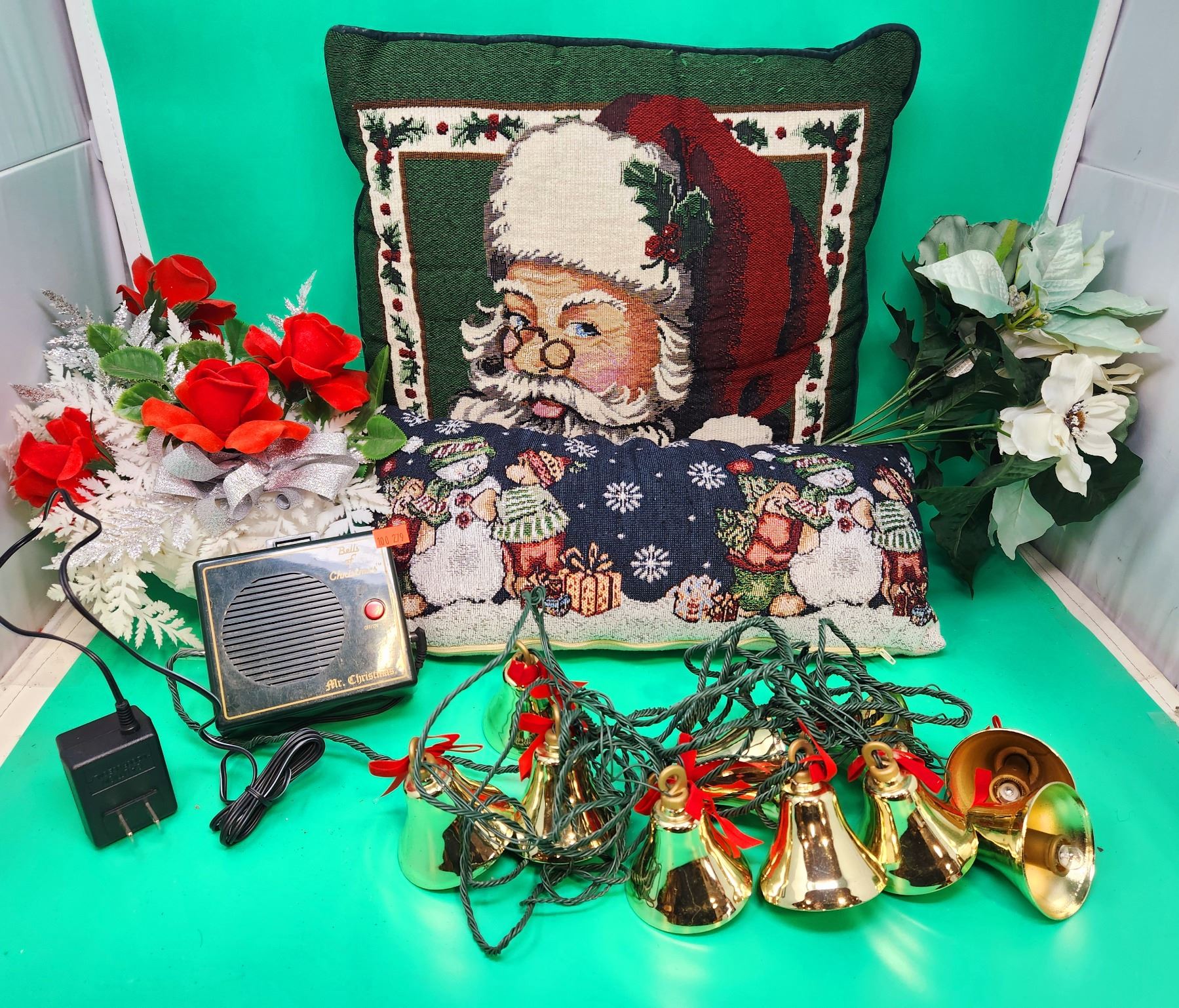 Christmas Decor Lot w/ Santa Claus Pillow, Floral Decorations, Bell String Lights, & More