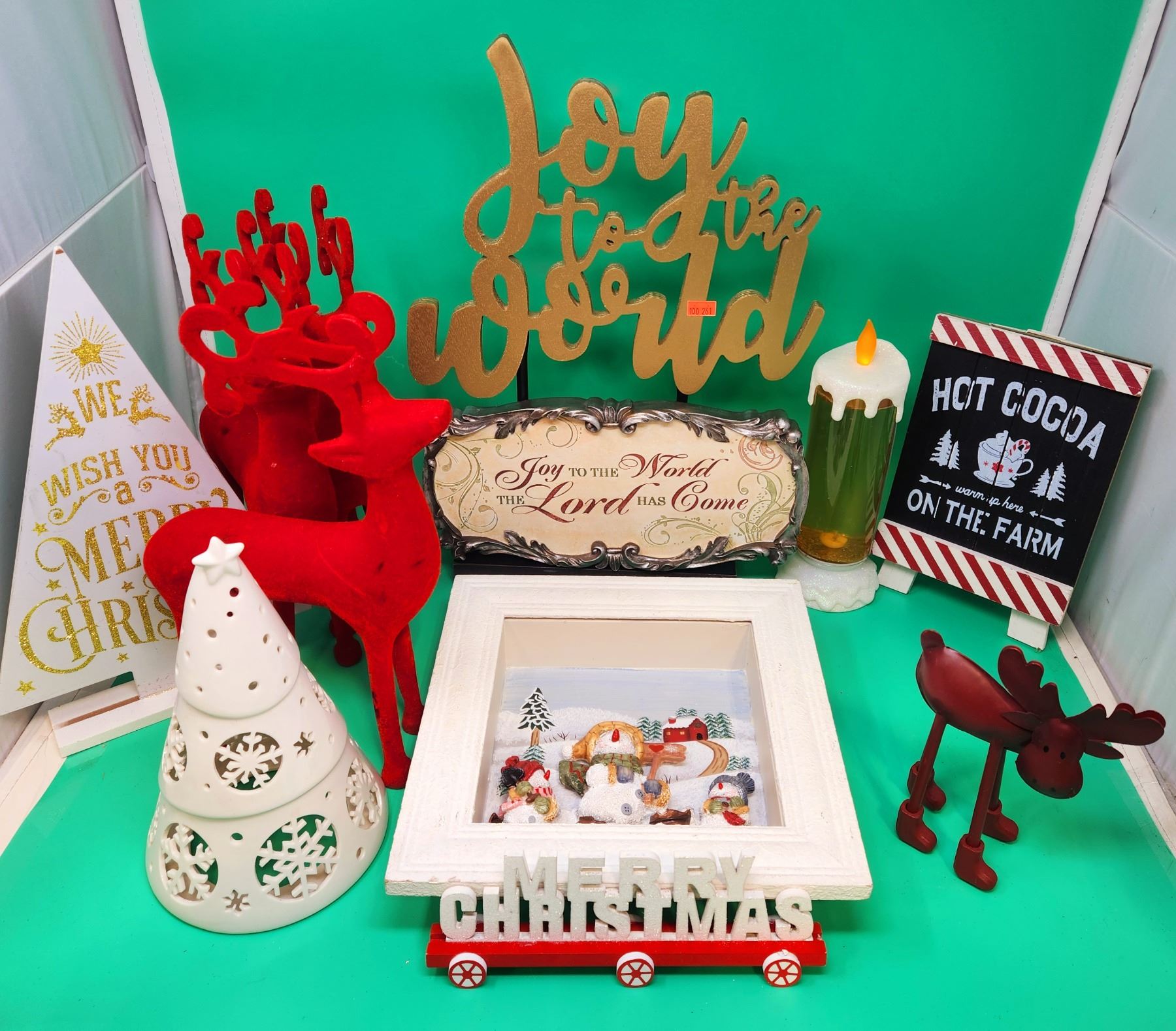 Christmas Decor Lot w/ Signs, Velvet Reindeer, Tree Tealight Holder, & More