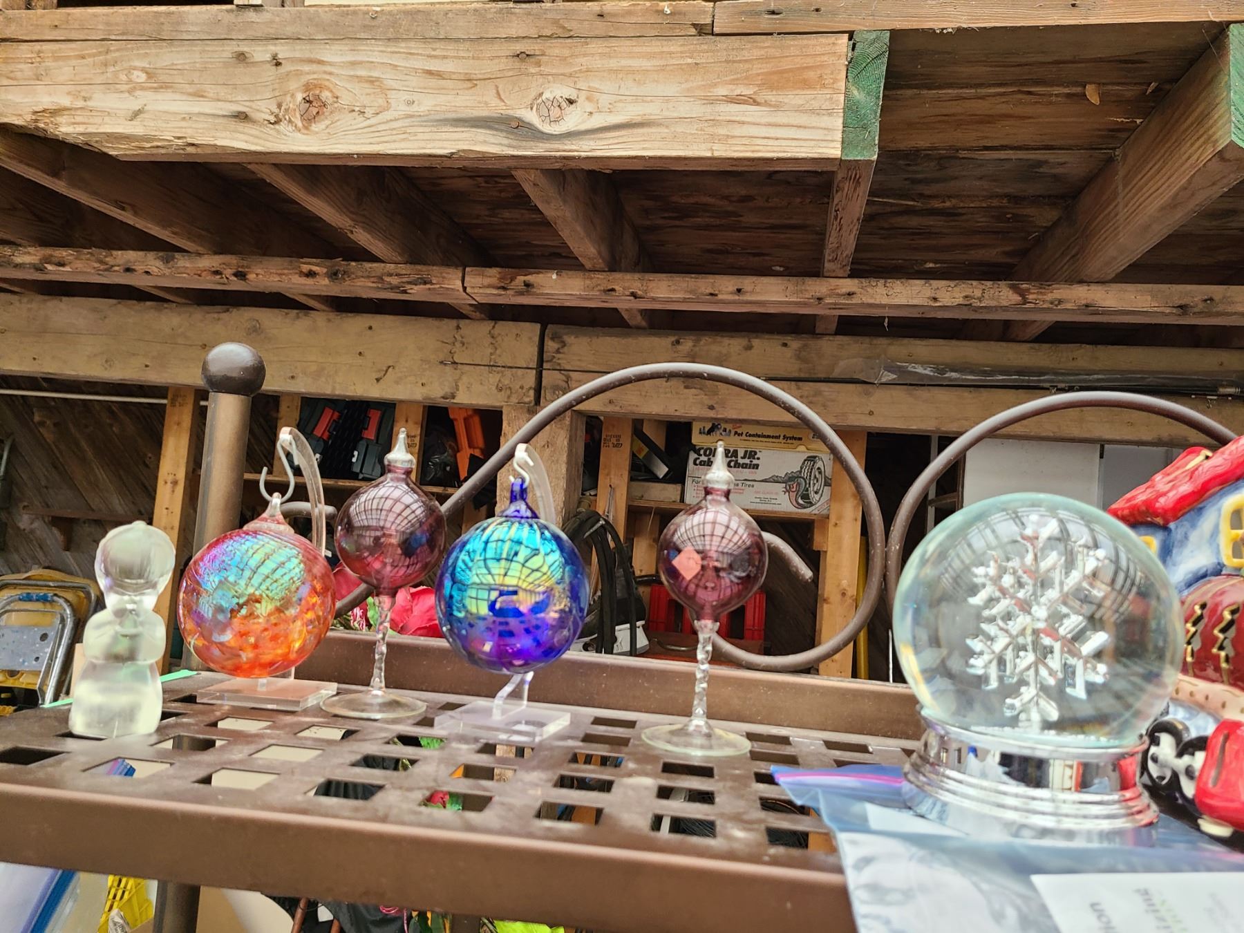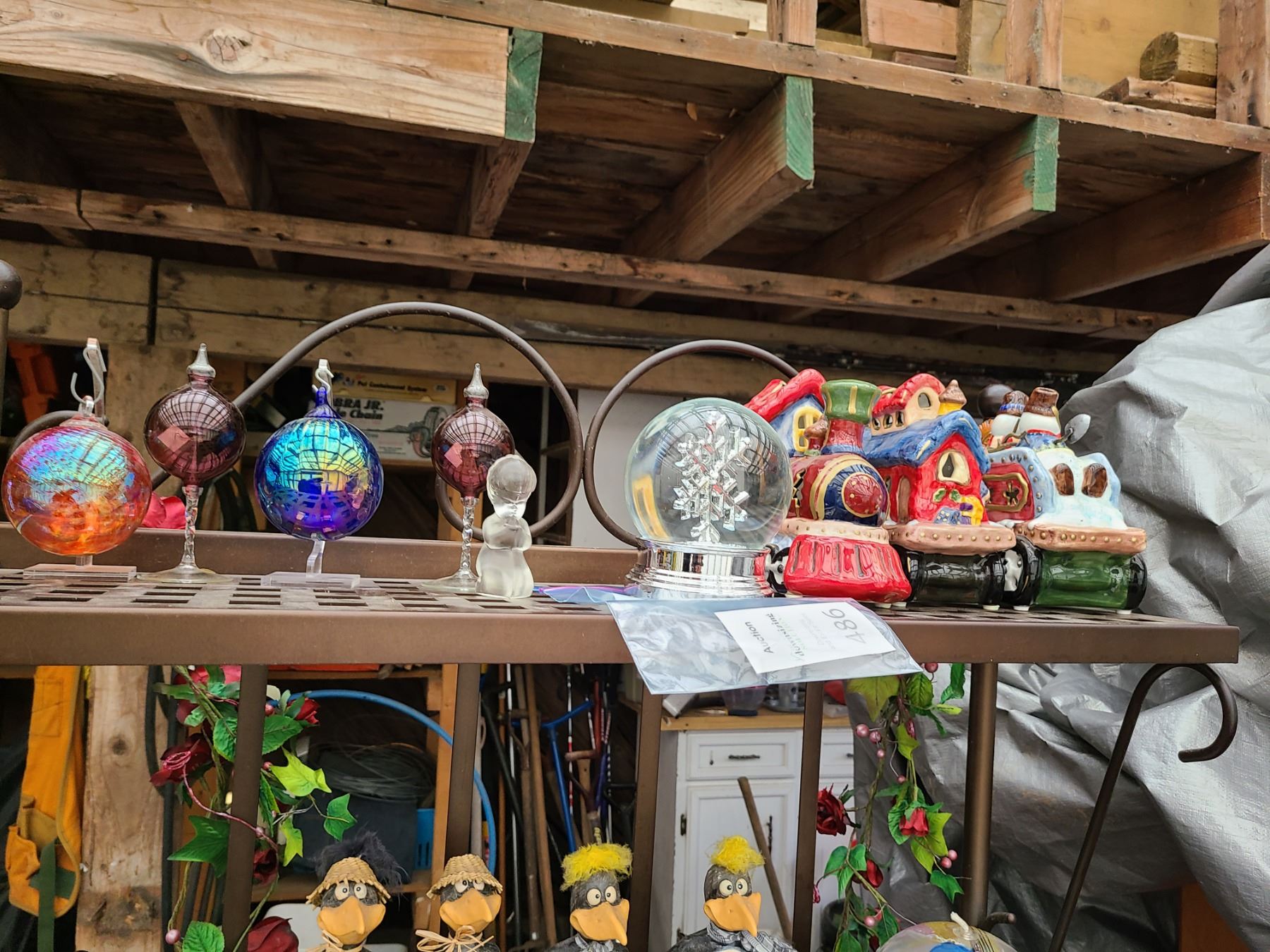 Assorted Christmas decor including ceramic trains and glass decor. Bring packing material. Pickup at 10 am.
