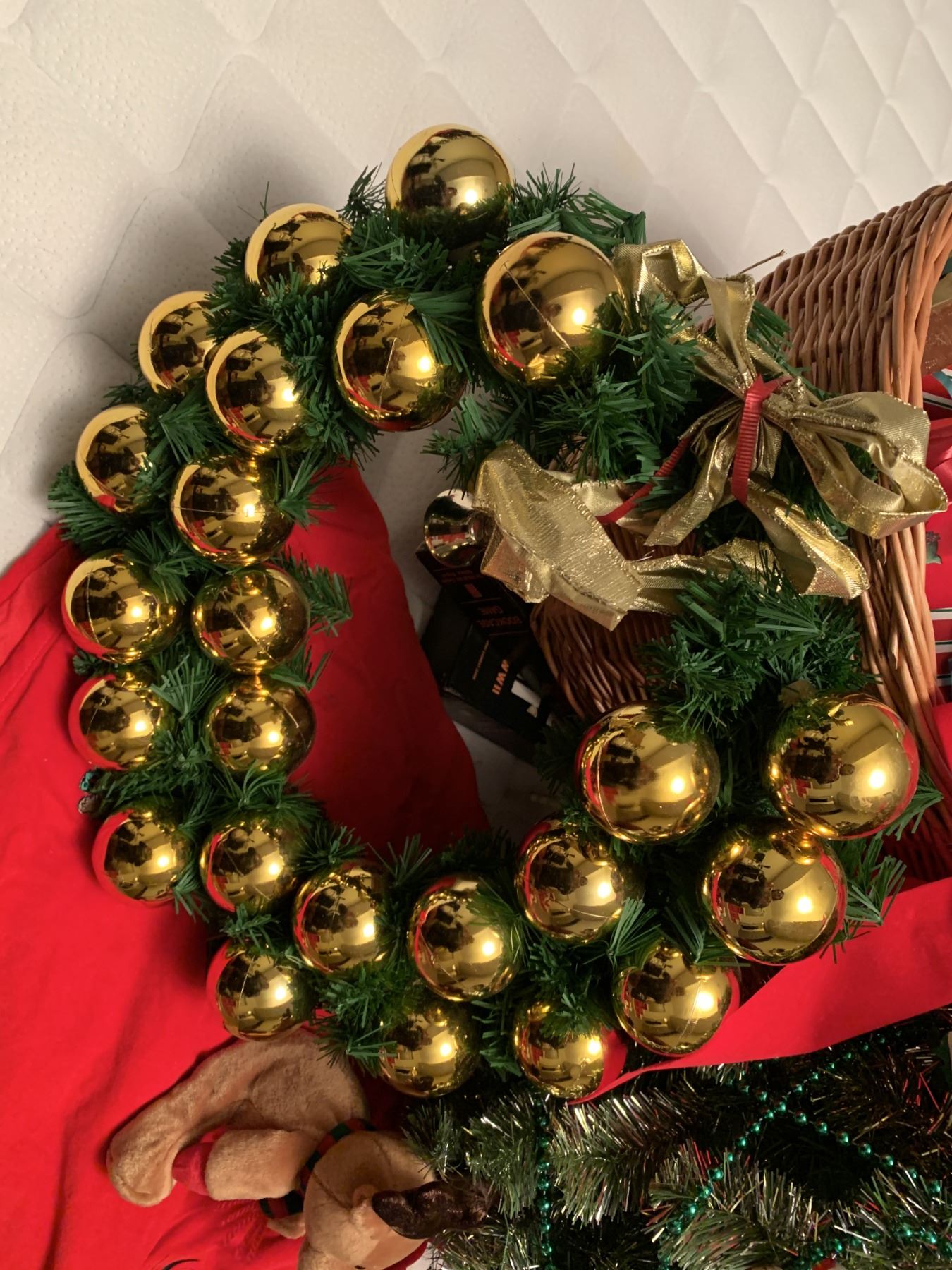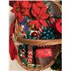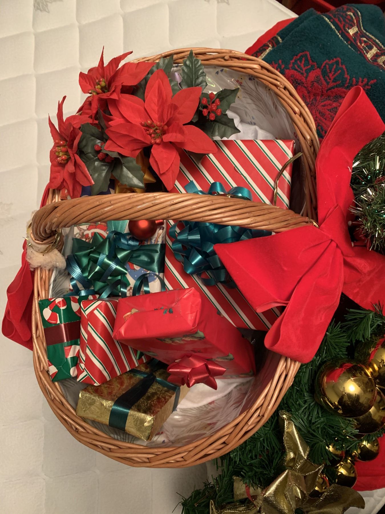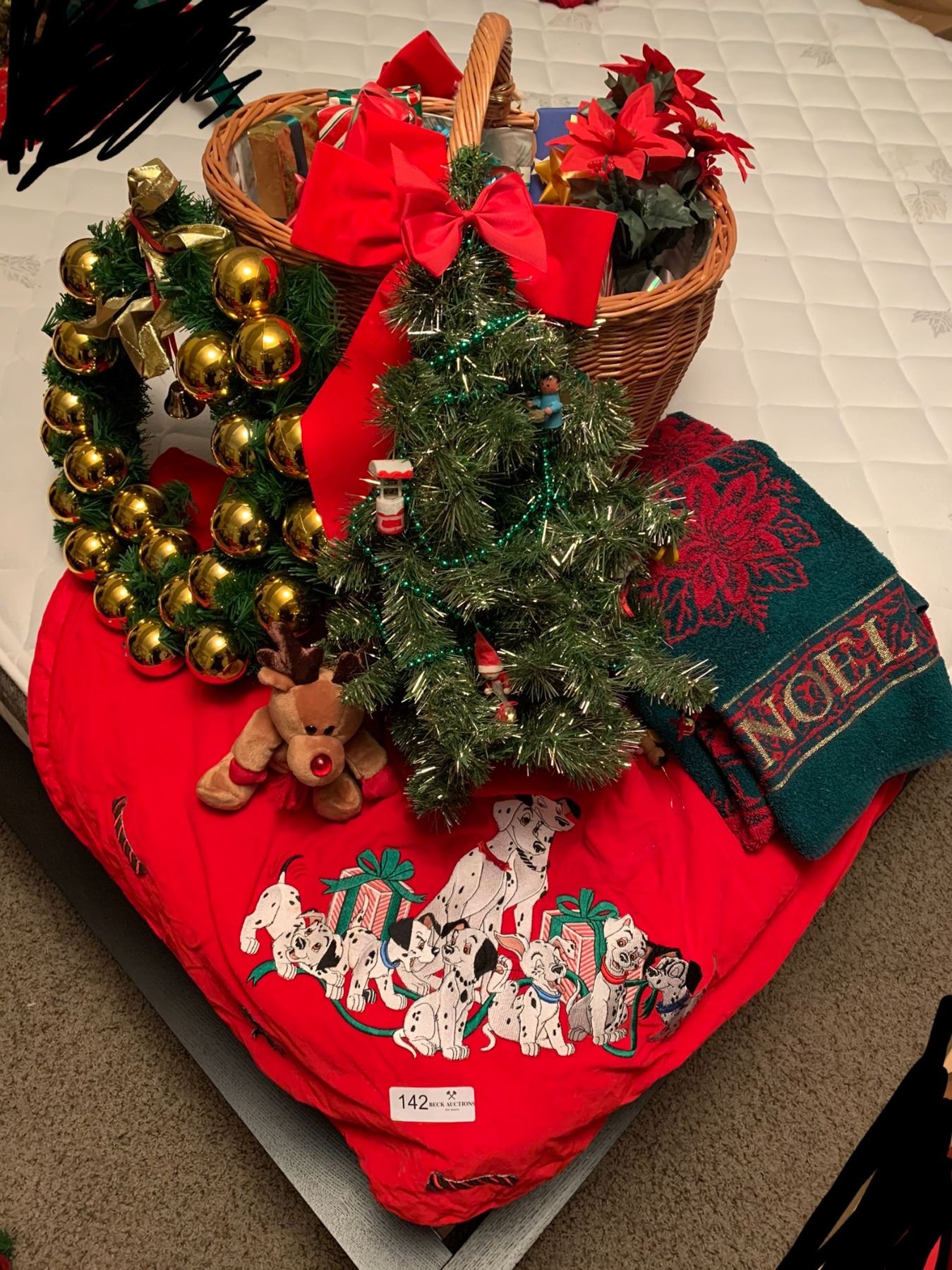 Adorable Disney tree skirt, 2x NOEL X-mas Towels, Decorative basket with beautiful red bow: filled with "mini gifts" (NOT REAL GIFTS JUST DECOR), 1x Christmas reef adorned with gold ornaments