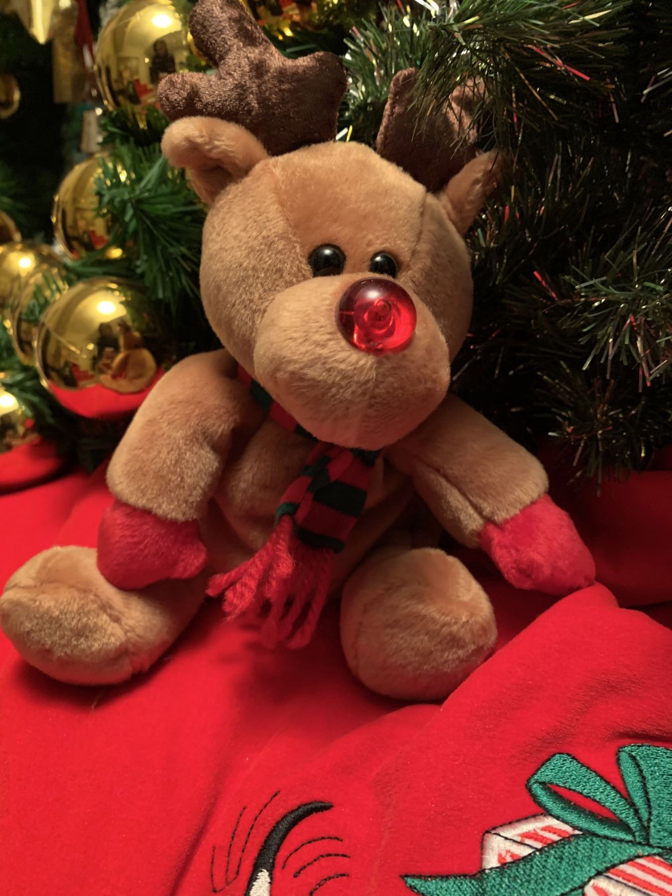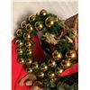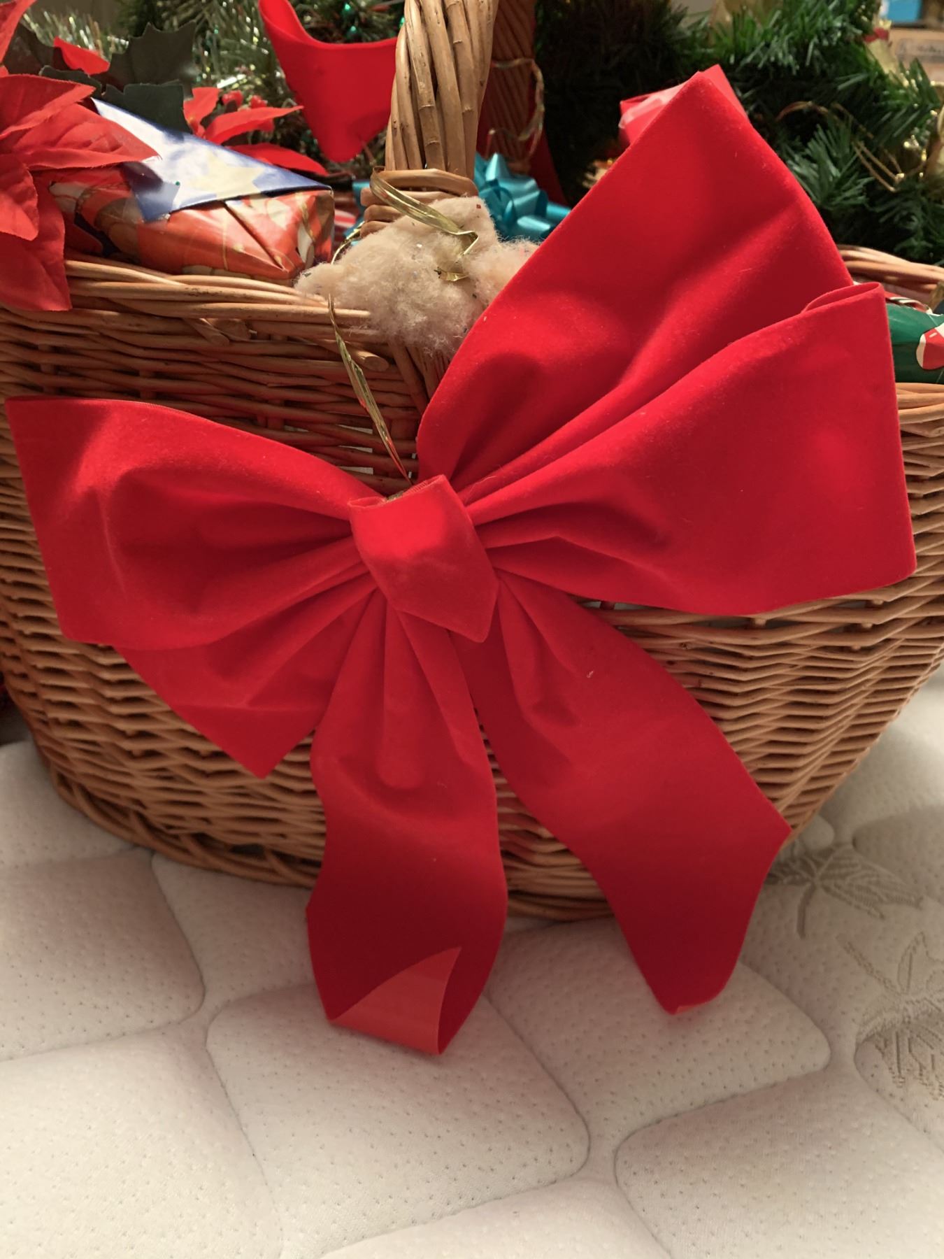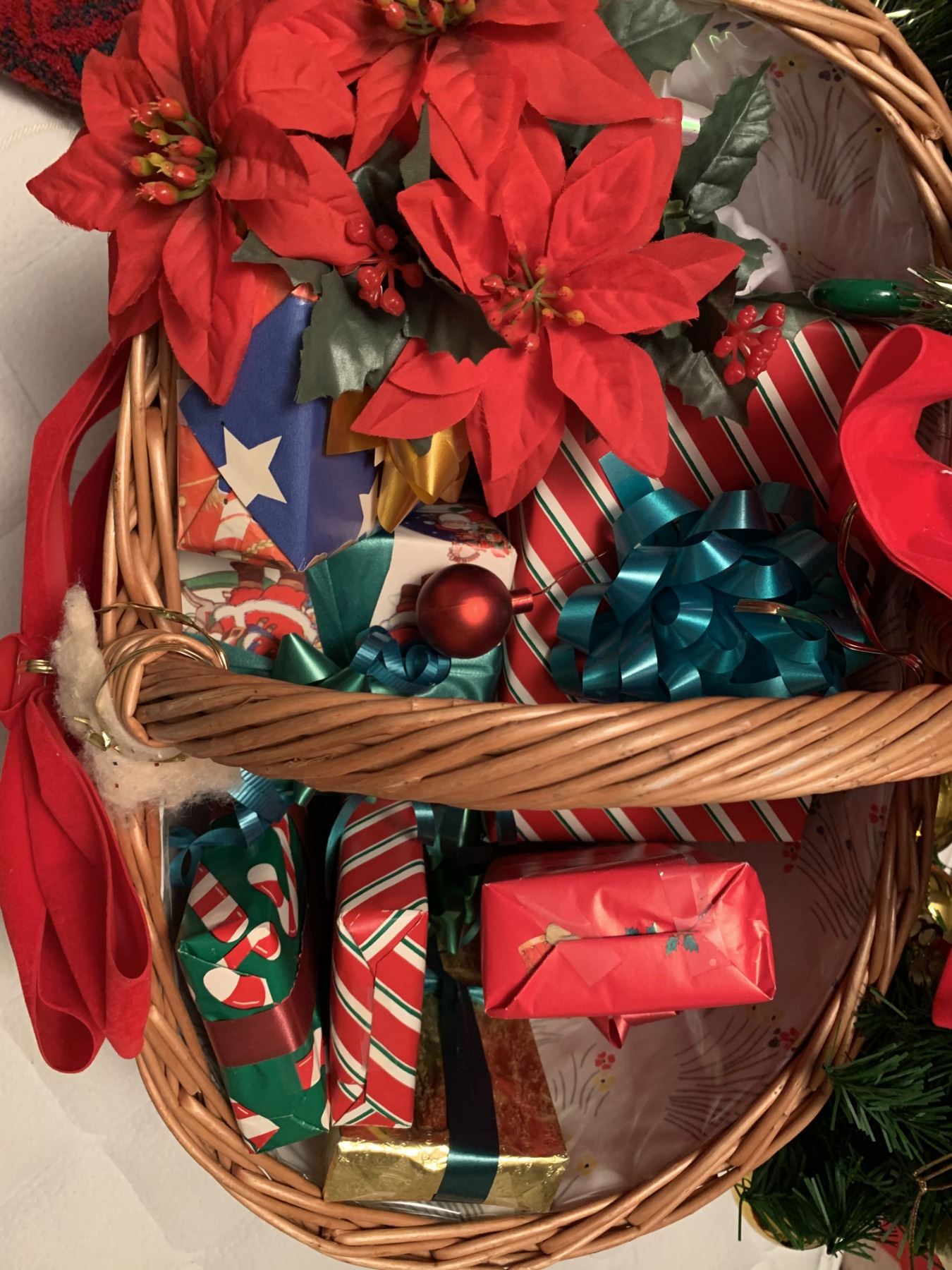 Adorable Disney tree skirt, 2x NOEL X-mas Towels, Decorative basket with beautiful red bow: filled with "mini gifts" (NOT REAL GIFTS JUST DECOR), 1x Christmas reef adorned with gold ornaments