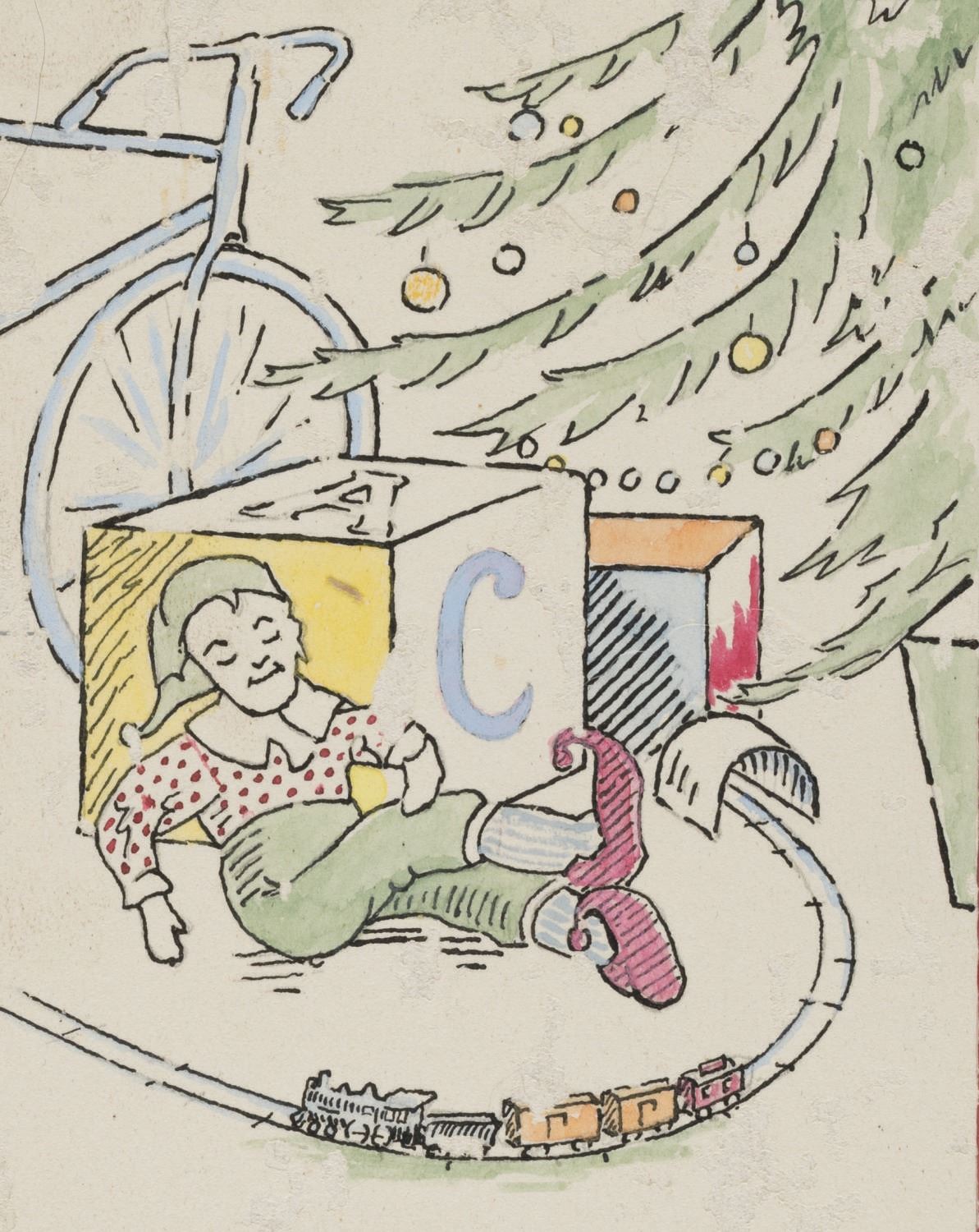 (1930s-40s) Original illustration art of a Christmas elf under a tree with toys. This is likely for a greeting card or storybook, dating back to the 1940s or 30s. Measuring 4.5"x3.5" on 4.75"x6" artboard, the piece is in fair condition, with spots of paper loss and scuffs throughout the image.