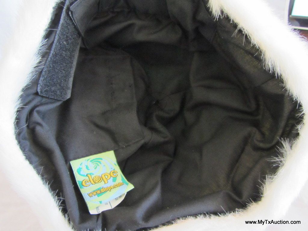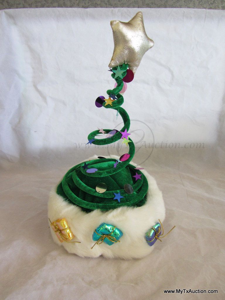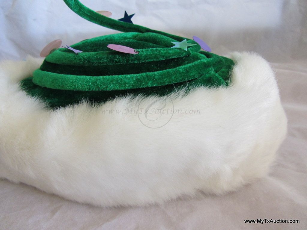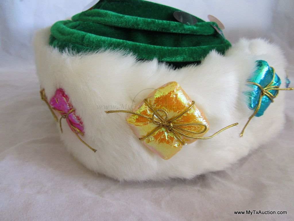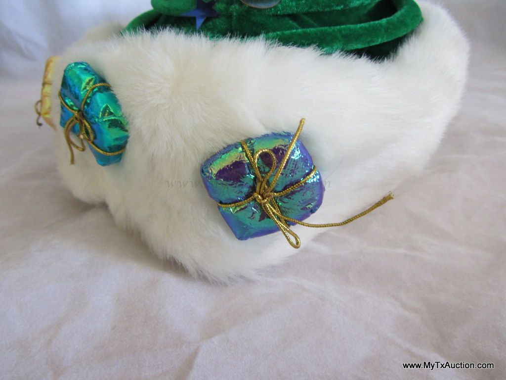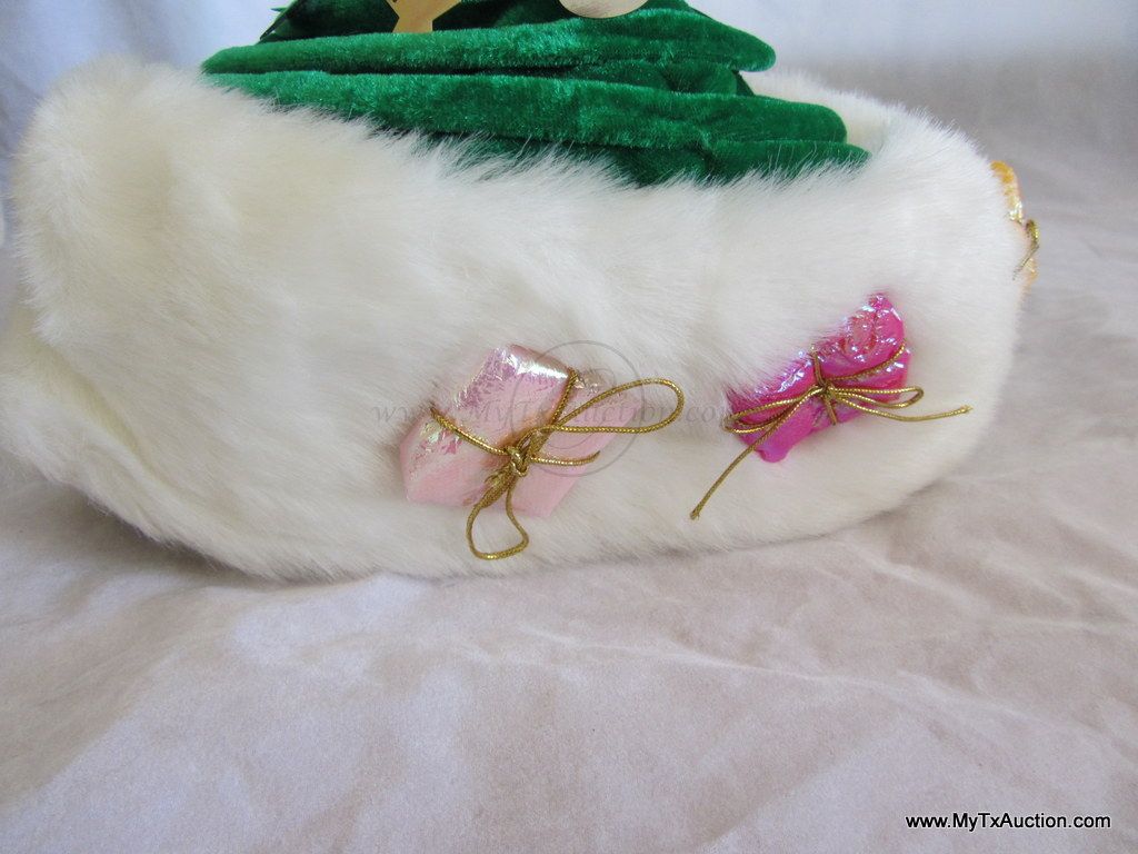 ELOPE hat 'everybody's laughing on planet earth' Green springy Christmas tree complete ornaments topped with a star and shiny wrapped presents under it. Great fun whimsical twist to your everyday red Santa's hat. The hat is made out of green velvet with faux fur, lined with fabric. The hat has a secret pocket with fortune inside. Has a Velcro size adjuster and adjusts form 23"-25" head fits most adults. NOTE: like new