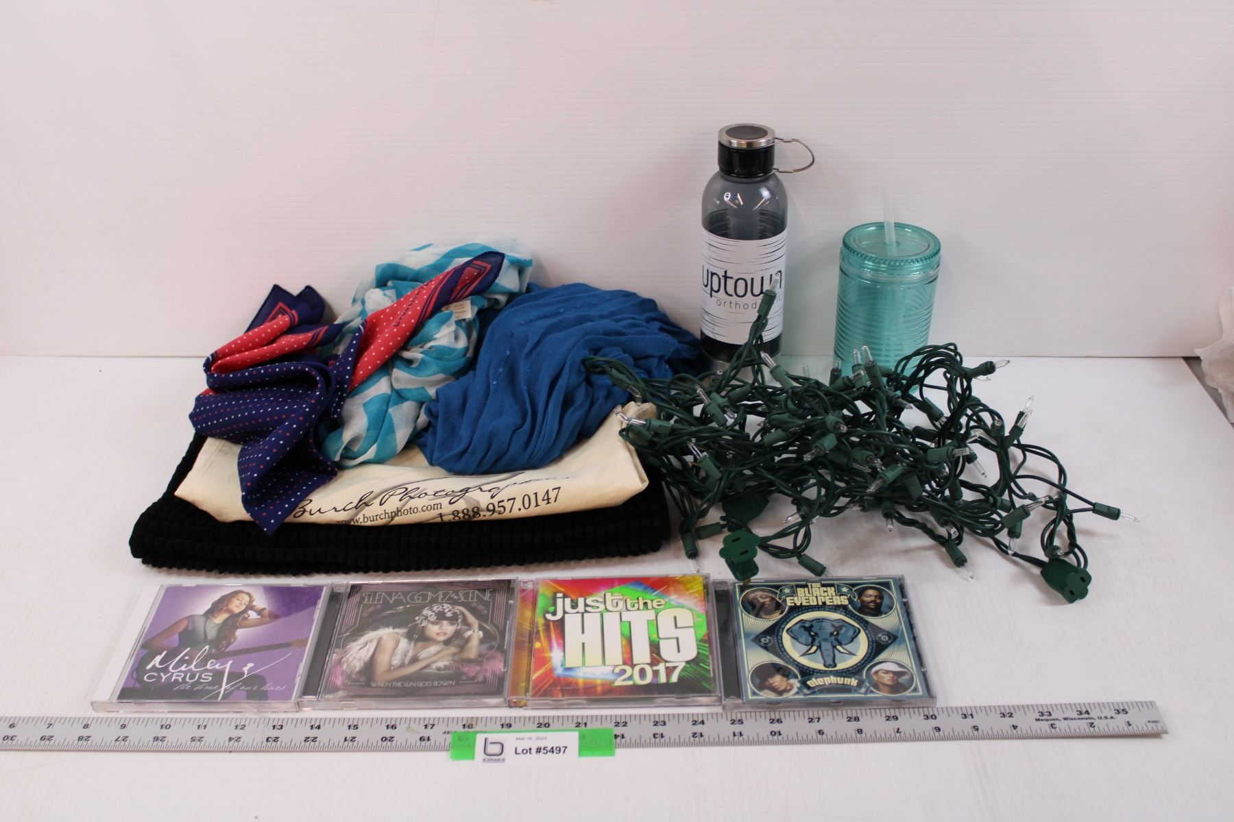 Christmas Lights and Misc - Scarves, Bathroom Mat, Water Bottle and CDs