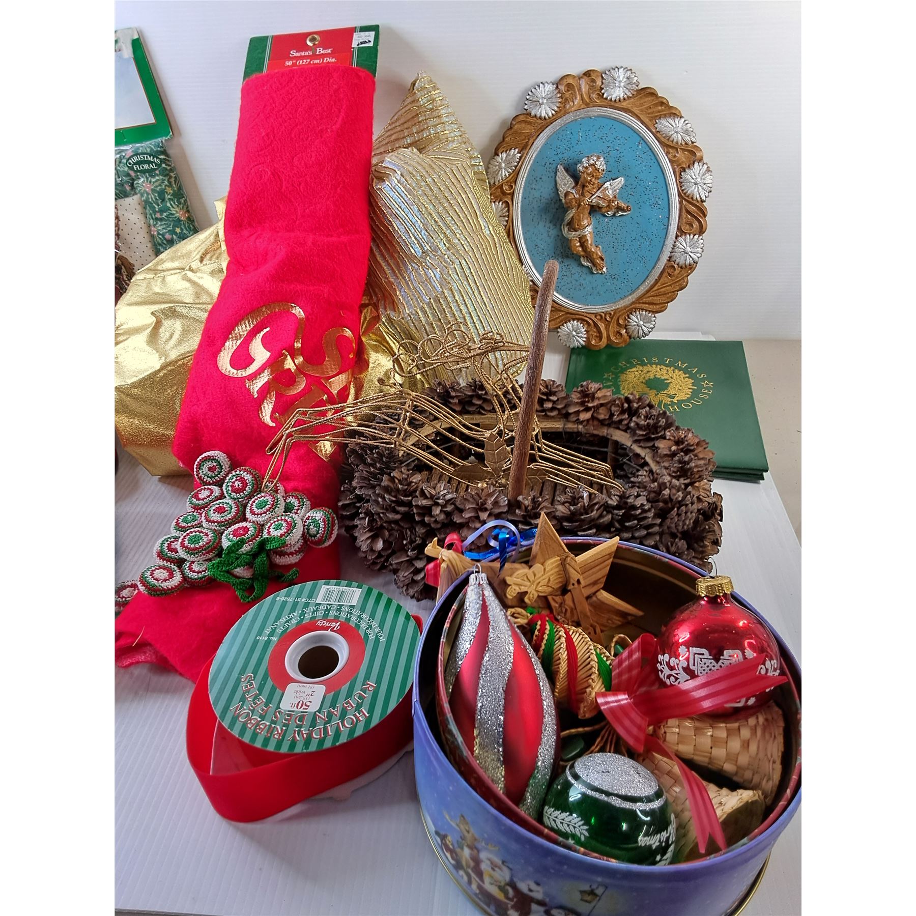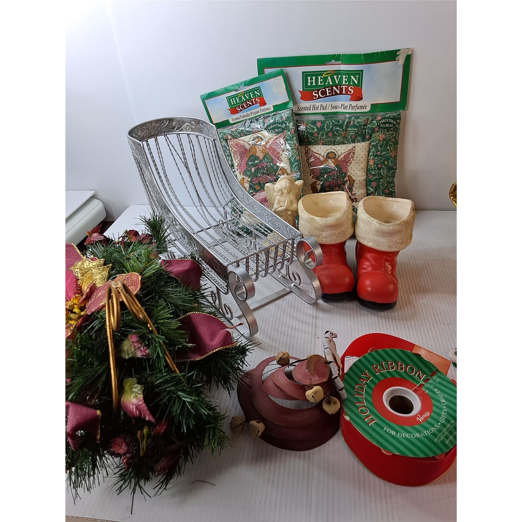 *Christmas Lot- (2) Tree Skirts, Ribbon, Decorative Sleighs, Misc.