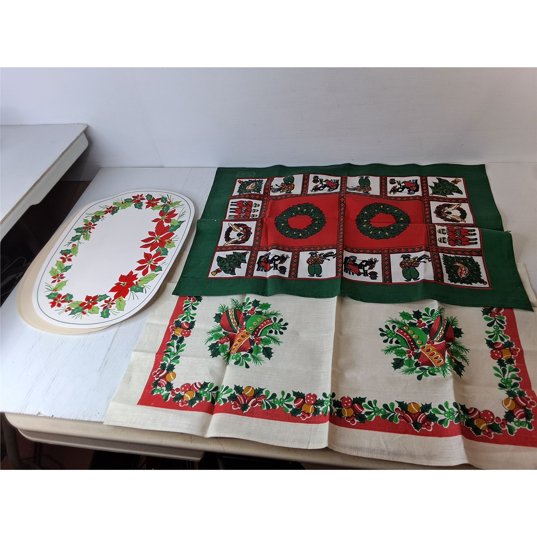 Christmas Lot- Fabric Santa Bag 18"x 26.27", (4) Placemats, (2) Tablerunners