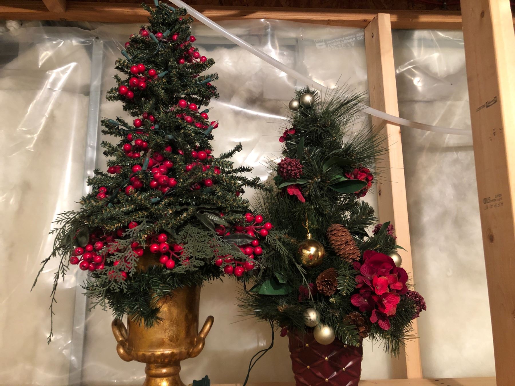 Tree with stand and lights 62" High - Ceramic tree with lights 17" High - Certerpiece with red vase 23" High - Tree with lights and gold vase 34" High