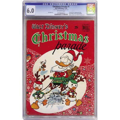 <B>Dell Giant Comics - Christmas Parade #1 (Dell, 1949) CGC FN 6.0 Off-white pages.</B></I> Appealing on so many levels -- a terrific wraparound Christmas cover, Carl Barks art, and appearances by Snow White and the Seven Dwarfs, Bambi, Dumbo, and Cinderella. Plus, this issue was the first Dell Giant. Overstreet 2006 FN 6.0 value = $174. CGC census 3/07: 1 in 6.0, 4 higher. <I> From the Cary and Cheryl Porter Collection.</B></I><BR><BR><b>Shipping:</b> Comics - Slabbed (certified) (<a target="_blank" href="http://www.heritageauctions.com/common/shipping.php">view shipping information</a>)