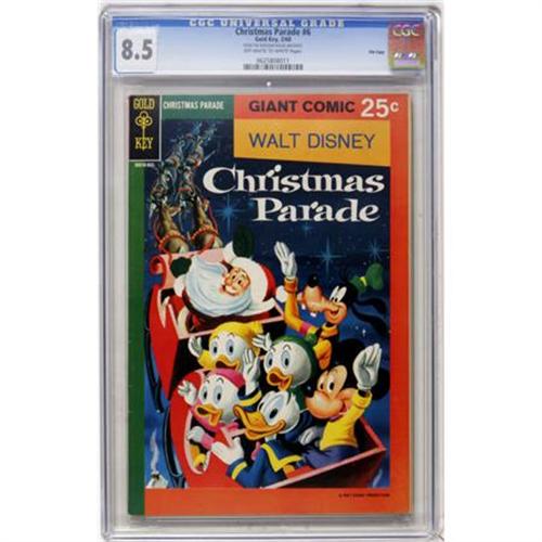 <B>Christmas Parade #6 File Copy (Gold Key, 1968) CGC VF+ 8.5 Off-white to white pages.</B></I> Reprints <B>Christmas Parade </B></I>#2 (Dell) with art by Carl Barks. Santa Claus pin-up on back cover. CGC notes, "From the Random House Archives." Overstreet 2007 VF 8.0 value = $49; VF/NM 9.0 value = $75. CGC census 10/07: 1 in 8.5, 1 higher.<BR><BR><b>Shipping:</b> Comics - Slabbed (certified) (<a target="_blank" href="http://www.heritageauctions.com/common/shipping.php">view shipping information</a>)