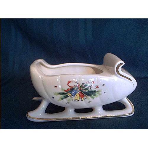 Sleigh Planter trimmed in gold with bells of red, blue, and yellow bound together with green pine. The marking reads "USA Stanfordware Sebring Ohio". The sleigh measures 7 inches wide and 3.5 inches high and is in excellent condition with no chips or cracks.