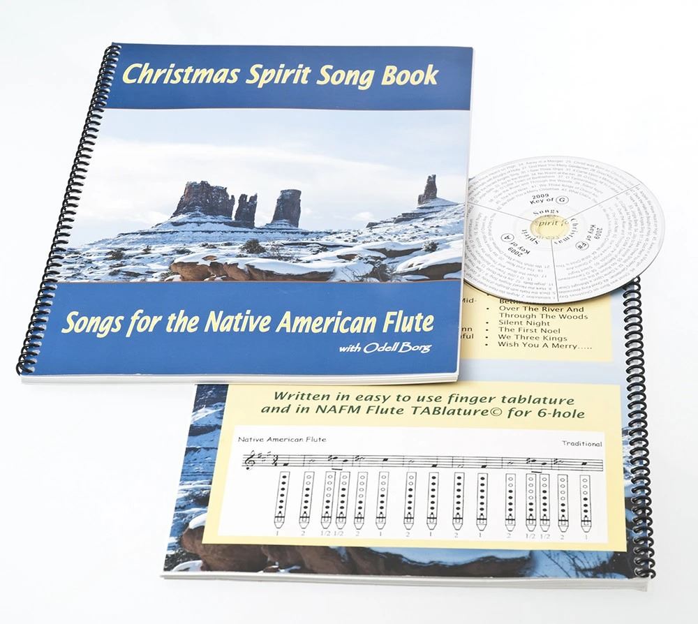 Christmas Spirit Song Book includes a collection of twenty holiday songs that are written in both music notation and with native flute fingering tablature. The native flute fingering tablature allows those who do do not read music to just follow the fingering chart diagrams to play any song. The song book also includes a play-along music CD, which includes short sections of all the songs in the keys of "A", "G" and "F#".