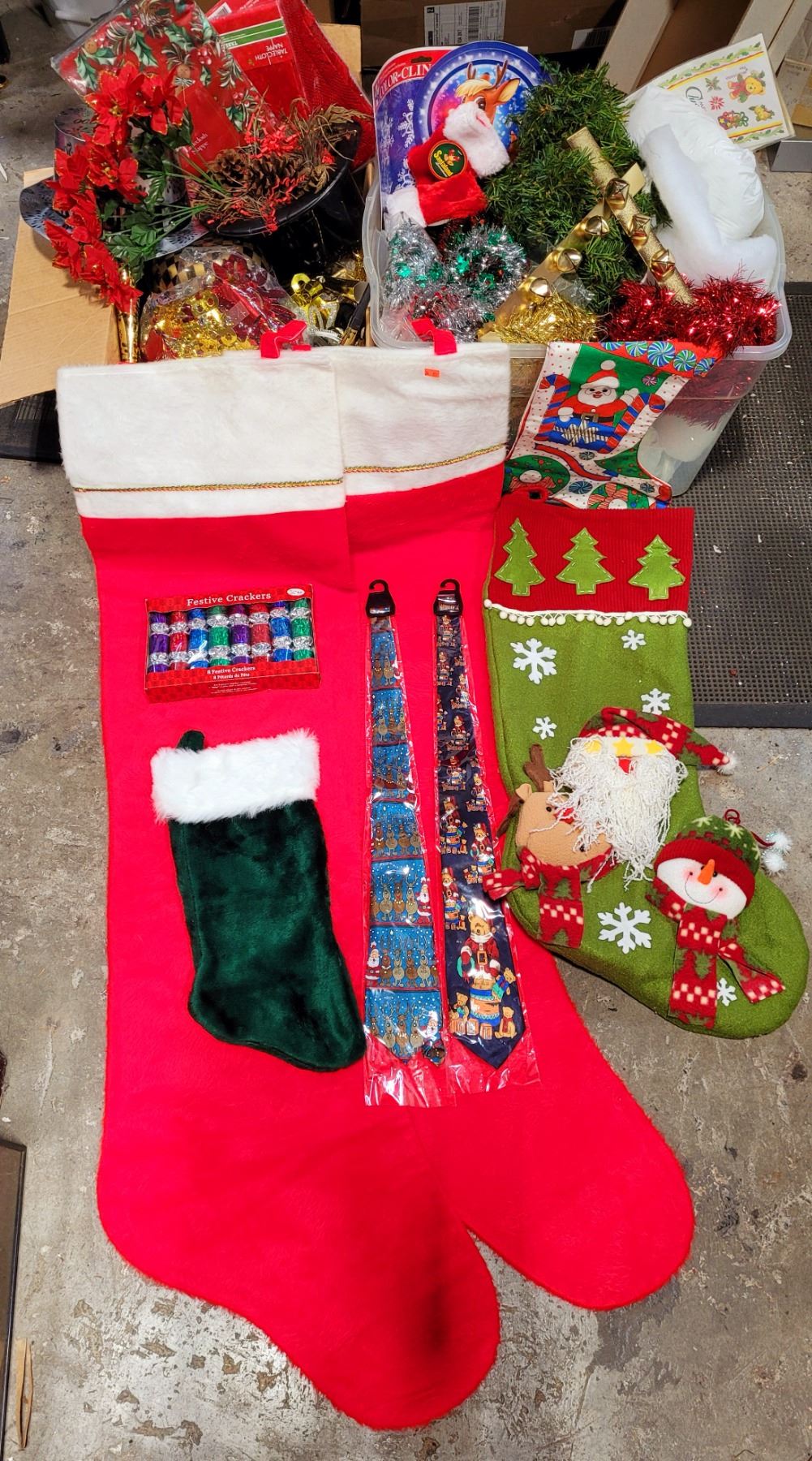 Christmas Stocking & Decor Lot w/ 2 Large Stockings, 2 Christmas Ties, Tablecloths, & More