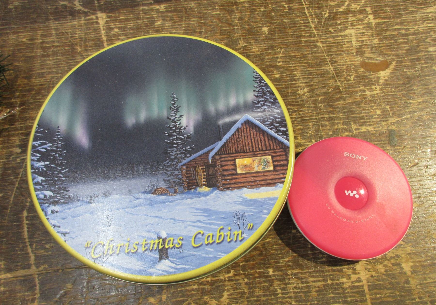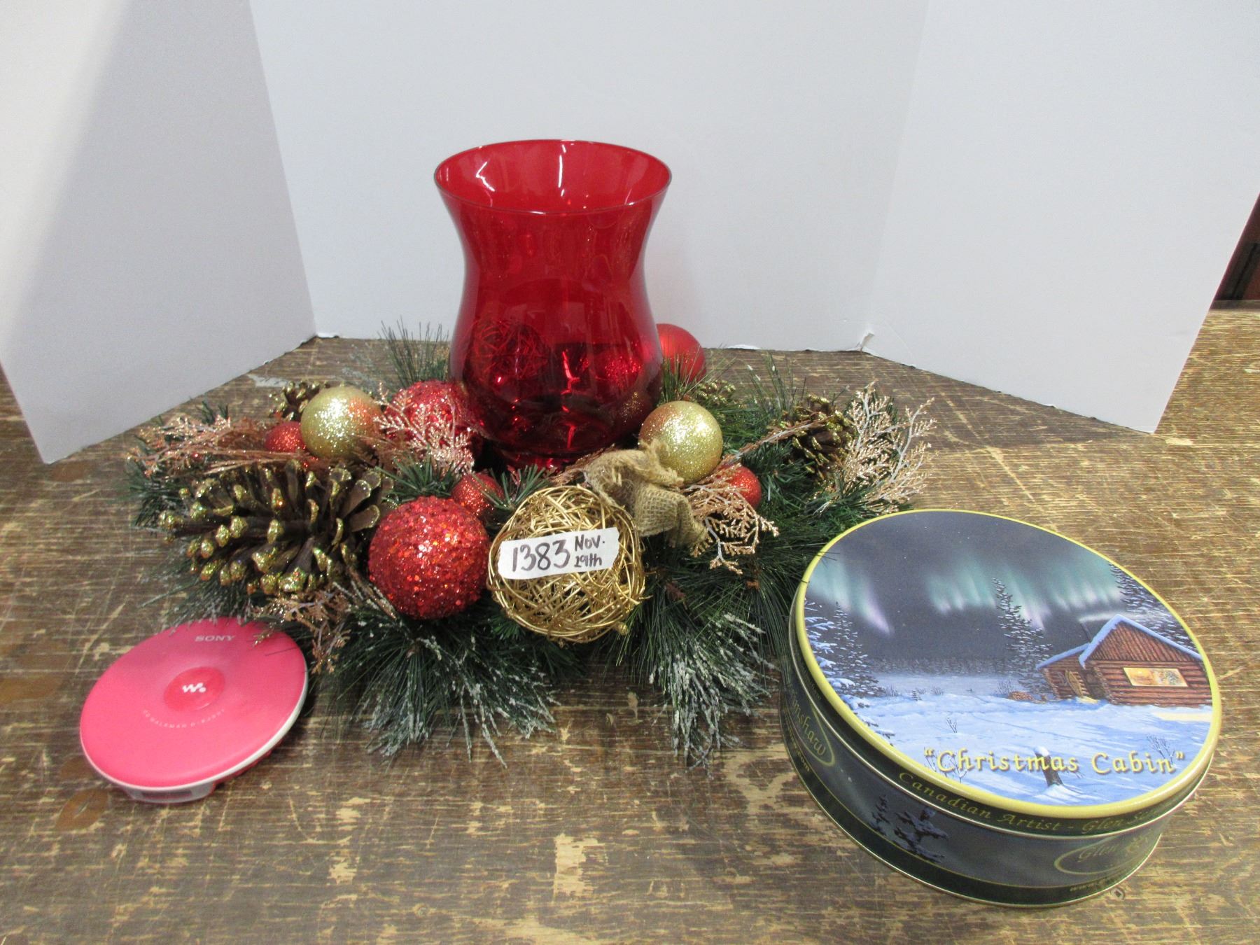 Christmas Table Décor, Christmas Tin and Pink Cd player