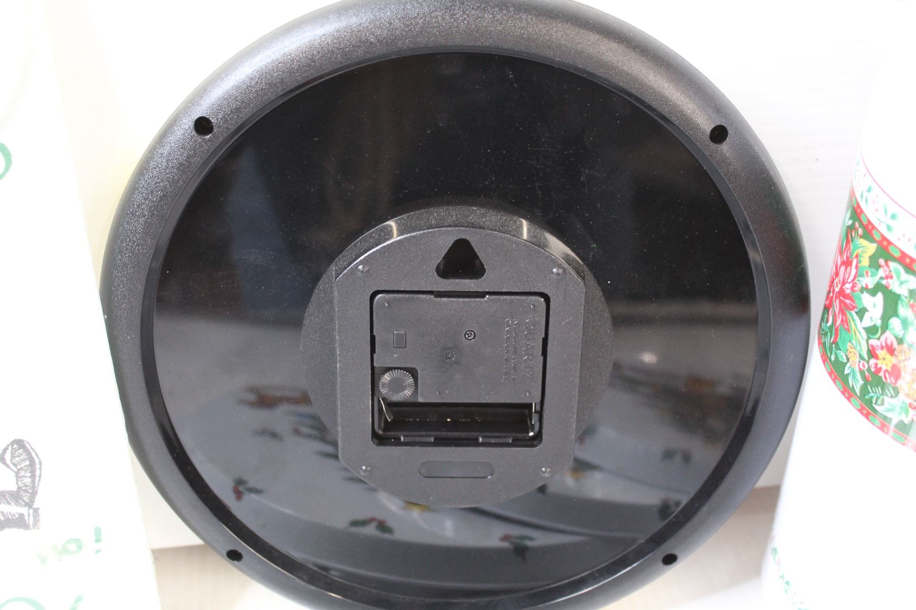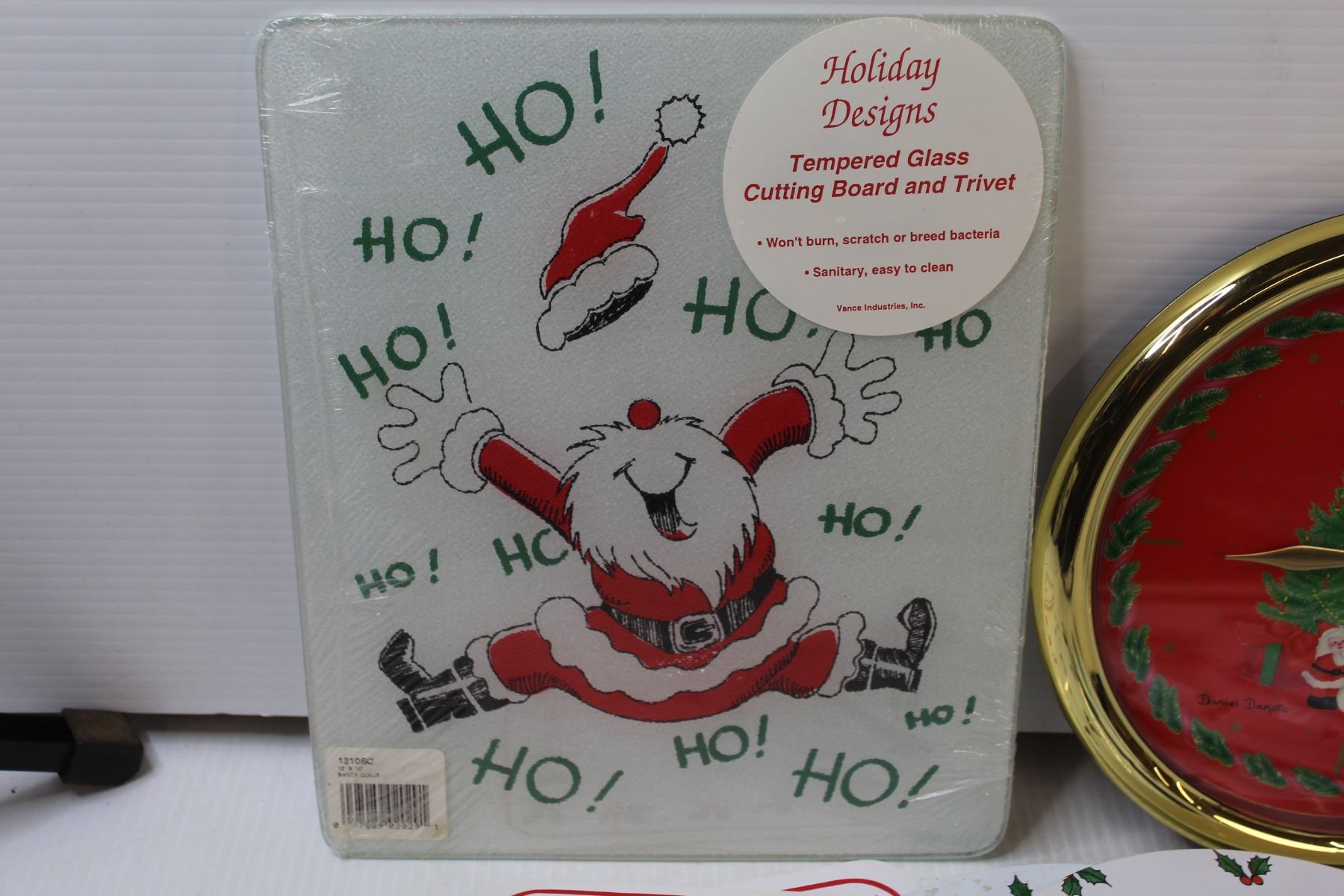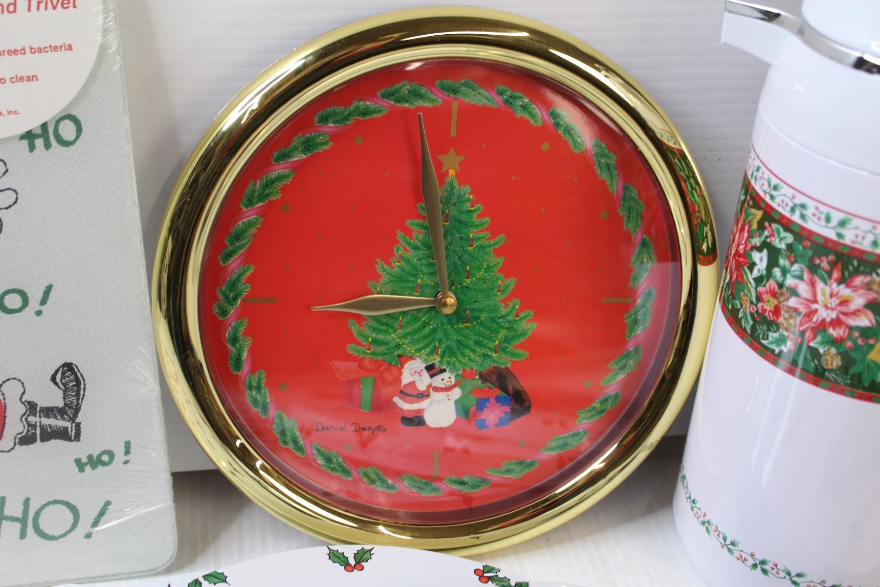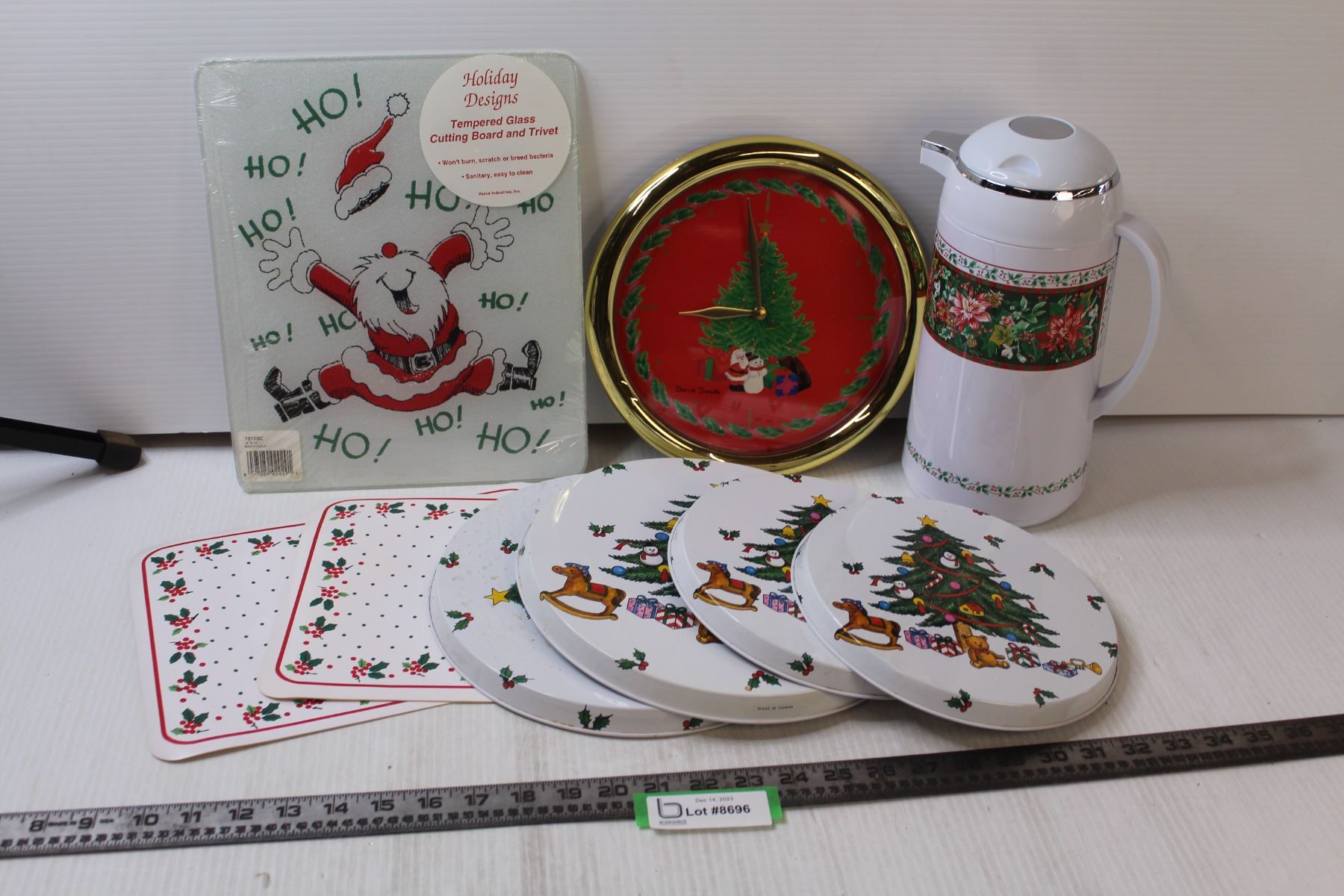 Christmas Themed Glass Cutting Board, Battery Powered Clock (untested), Coffee Pot, (2) Placemats, (4) Oven top covers