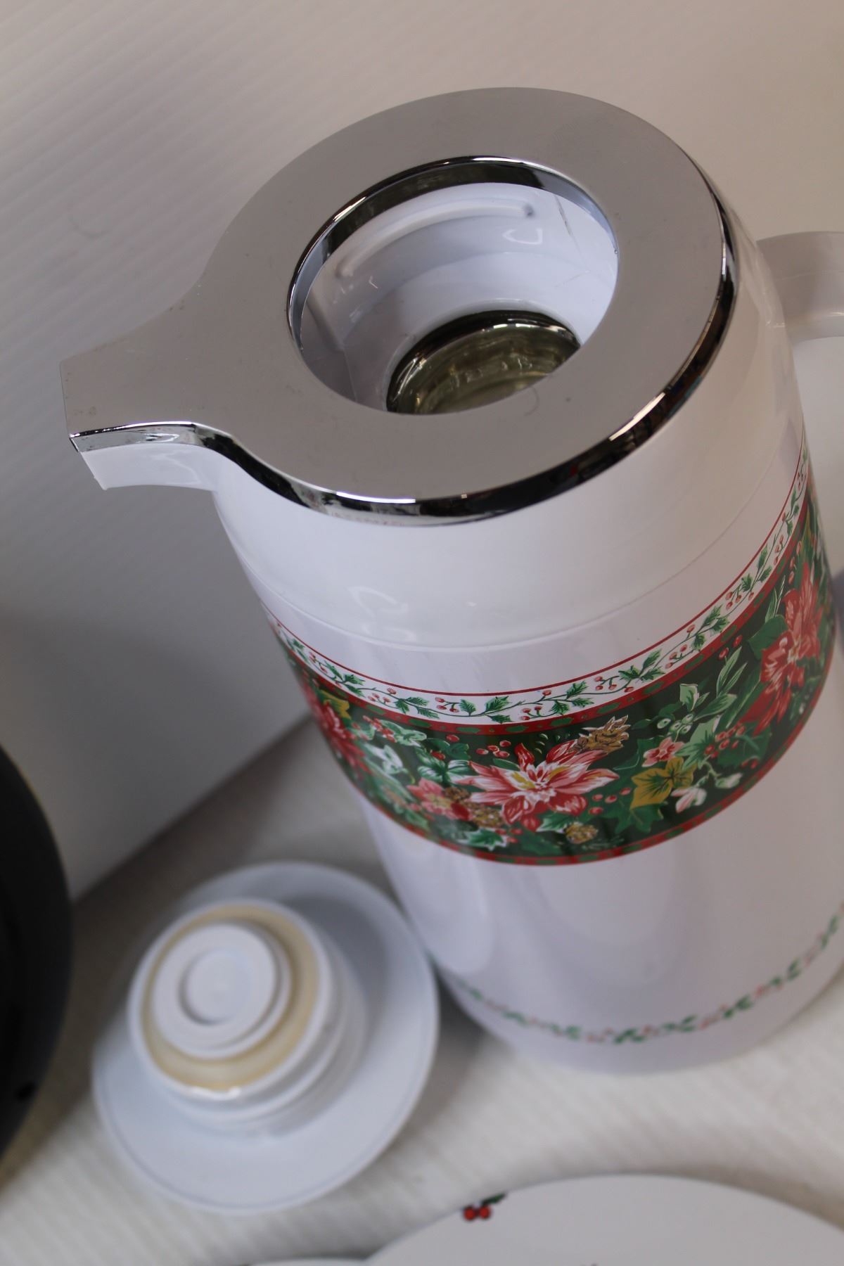 Christmas Themed Glass Cutting Board, Battery Powered Clock (untested), Coffee Pot, (2) Placemats, (
