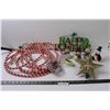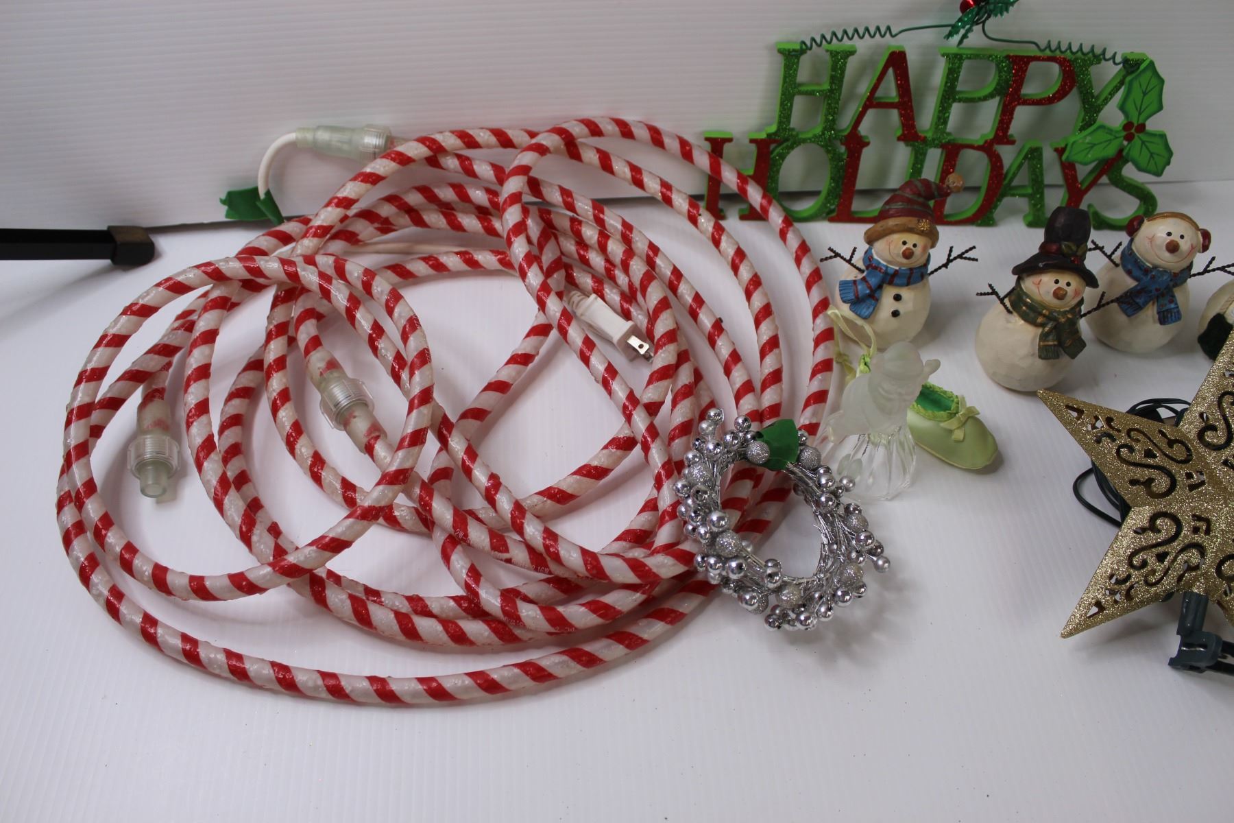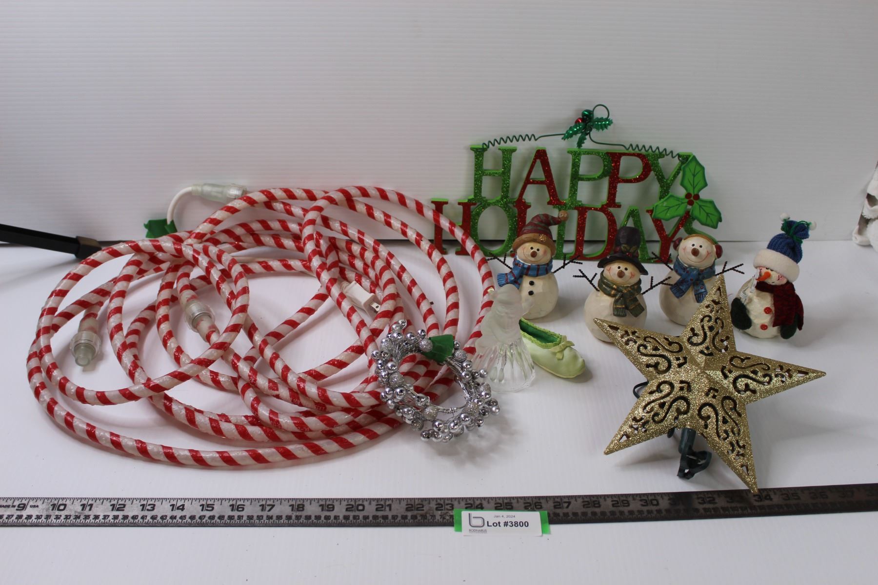 Christmas Tree Light-up Star (Works), (4) Snowmen, Happy Holidays Sign, Clear Glass Santa Bell, Candy Cane Style Rope Lights (Works) Silver Garland