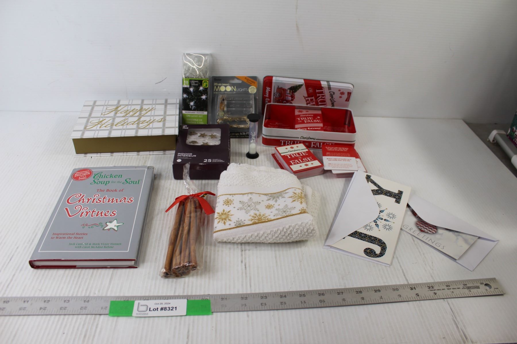 Christmas True Of False - As Is, (2) Christmas Cards, Lights, Book Storage Container, The Book Of Christmas Virtues