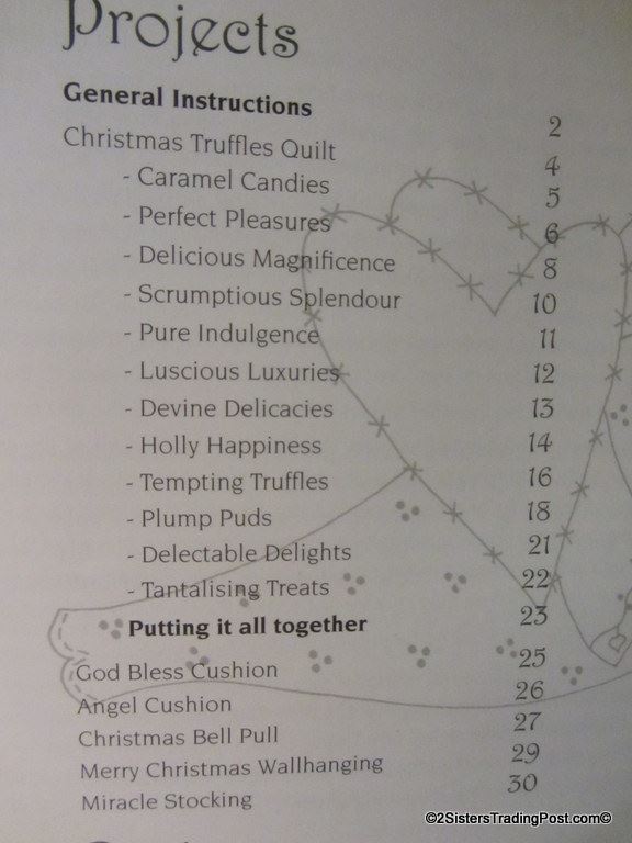 Kit includes book with 12 Christmas truffles quilt designs to make God Bless Cushion, Angel Cushion, Christmas Bell Pull, Merry Christmas Wall-hanging and a Miracle Stocking Plus 6 recipes 1. Christmas Pudding Truffles 2. Double Choc Orange Truffle Balls 3. Marshmallow Surprises 4. Mars Bar Truffles 5. Macadamia Truffles & 6. Chocpeppermint Balls MSRP on BOOK is $22.00 plus 10 pieces of fabric. Large white piece with small snowflake pattern (see image 7 has been magnified to show details is not the true color) what looks to be fat quarters of 4 reds and 4 greens plus 1 double green or 1/2 yard. MSRP on complete kit $70.00 Kit is put together and sold by The Needle Niche.