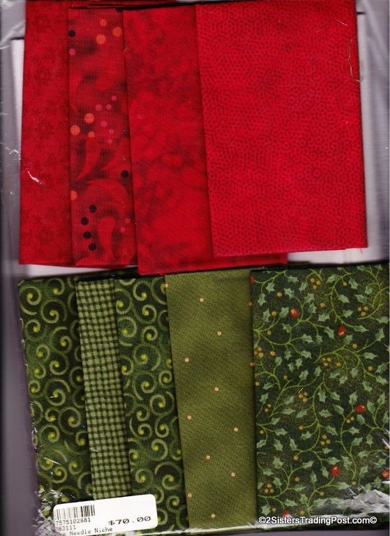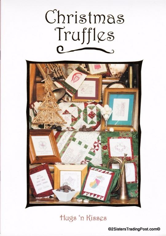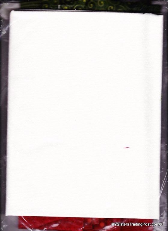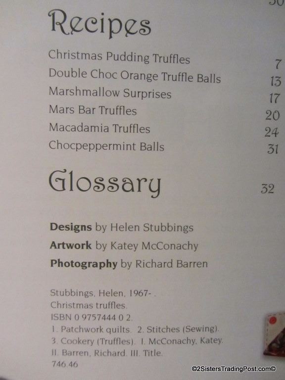 Kit includes book with 12 Christmas truffles quilt designs to make God Bless Cushion, Angel Cushion, Christmas Bell Pull, Merry Christmas Wall-hanging and a Miracle Stocking Plus 6 recipes 1. Christmas Pudding Truffles 2. Double Choc Orange Truffle Balls 3. Marshmallow Surprises 4. Mars Bar Truffles 5. Macadamia Truffles & 6. Chocpeppermint Balls MSRP on BOOK is $22.00 plus 10 pieces of fabric. Large white piece with small snowflake pattern (see image 7 has been magnified to show details is not the true color) what looks to be fat quarters of 4 reds and 4 greens plus 1 double green or 1/2 yard. MSRP on complete kit $70.00 Kit is put together and sold by The Needle Niche.