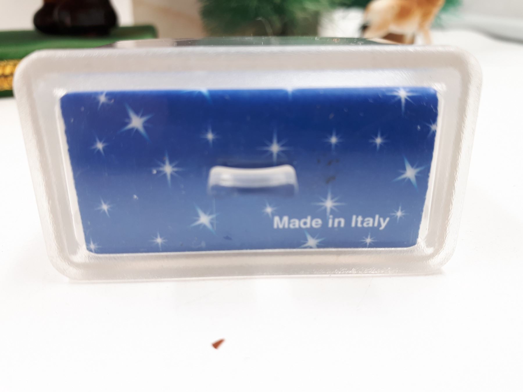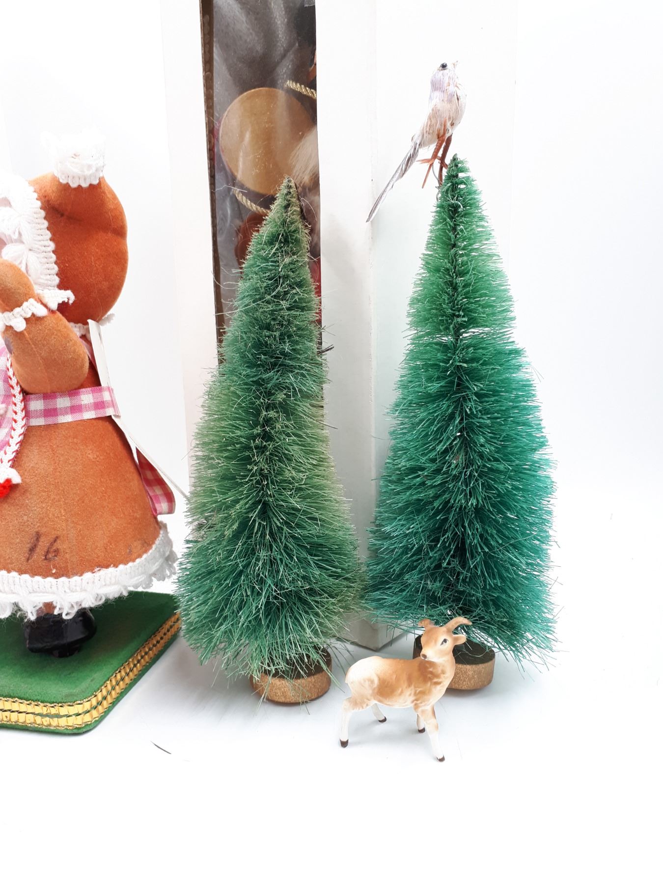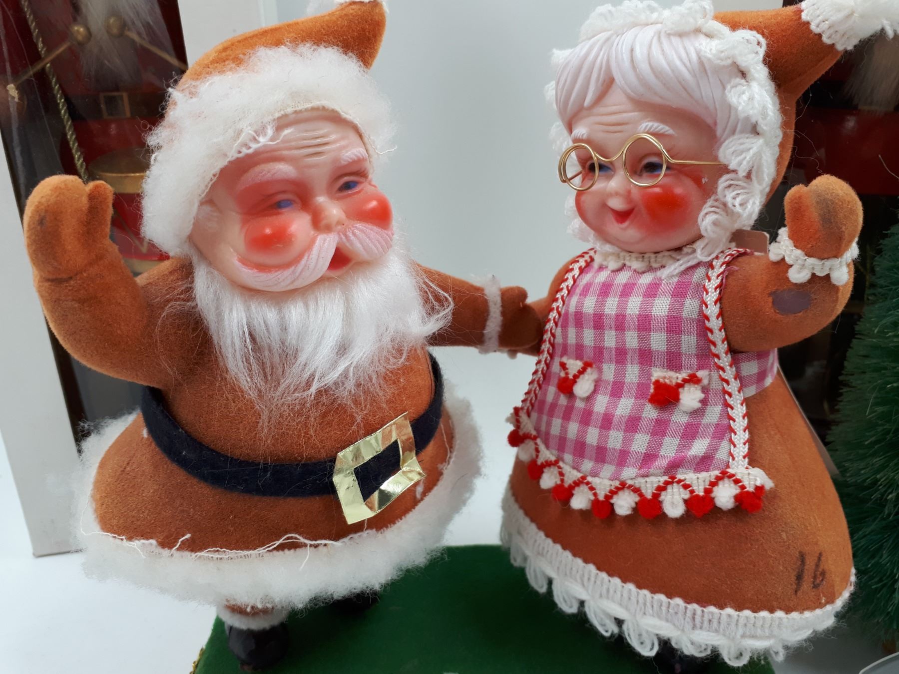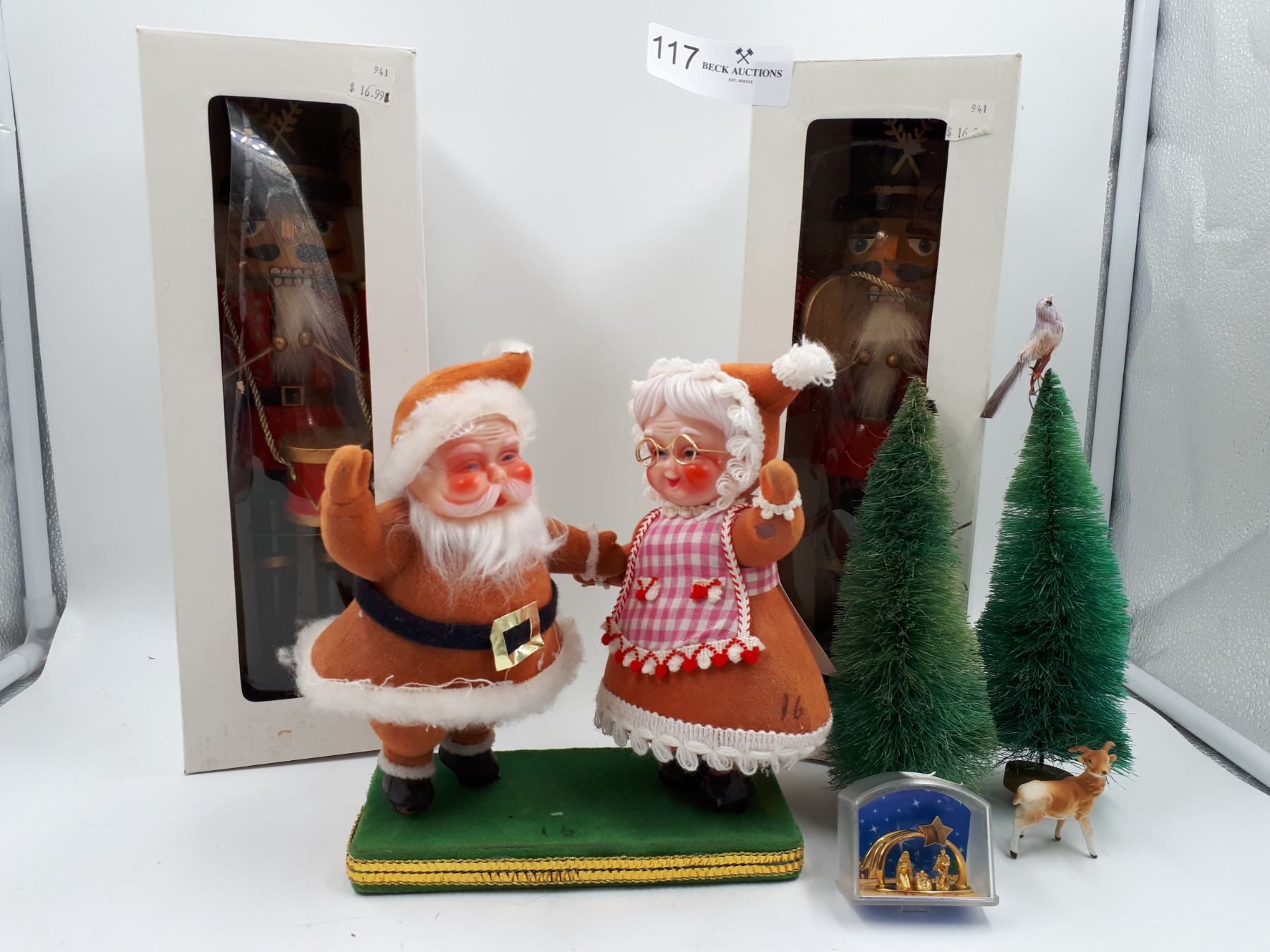 Christmas decor including two 12" Nutcracker drummers, a vintage Santa couple made in Hong Kong, a small nativity gold plated piece, and some tree's.
