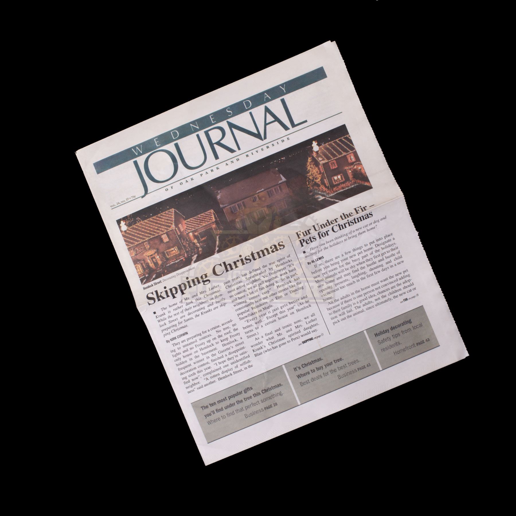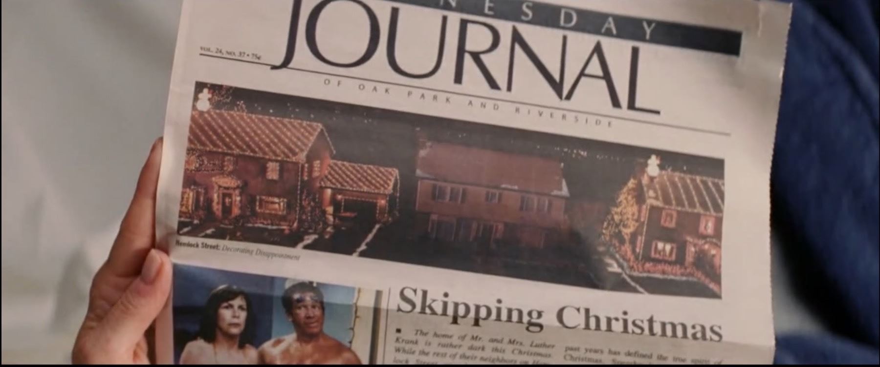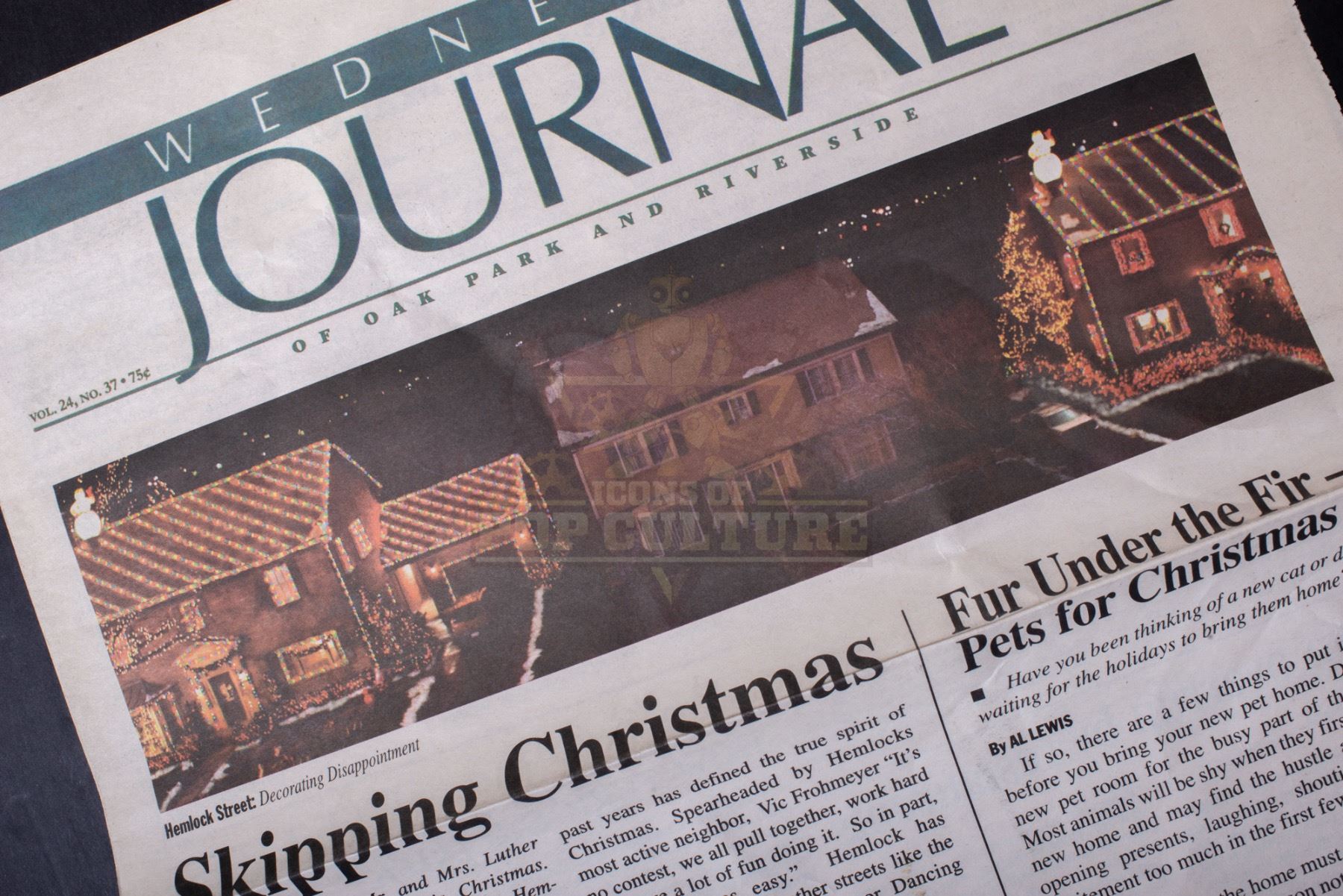 This prop newspaper was custom printed by the production for use by Tim Allen as “Luther Krank” and Jamie Lee Curtis as “Nora Krank”. The Wednesday Journal newspaper features the headline “Skipping Christmas” with the image of the Krank’s house with no Christmas lights, or Frosty up on the roof. This prop newspaper is an unused alternate, as the version seen on screen features the images of Luther and Nora Krank at the tanning spa and their un-decorated house. The newspaper remains in very good condition and measures 11.5” x 14”.