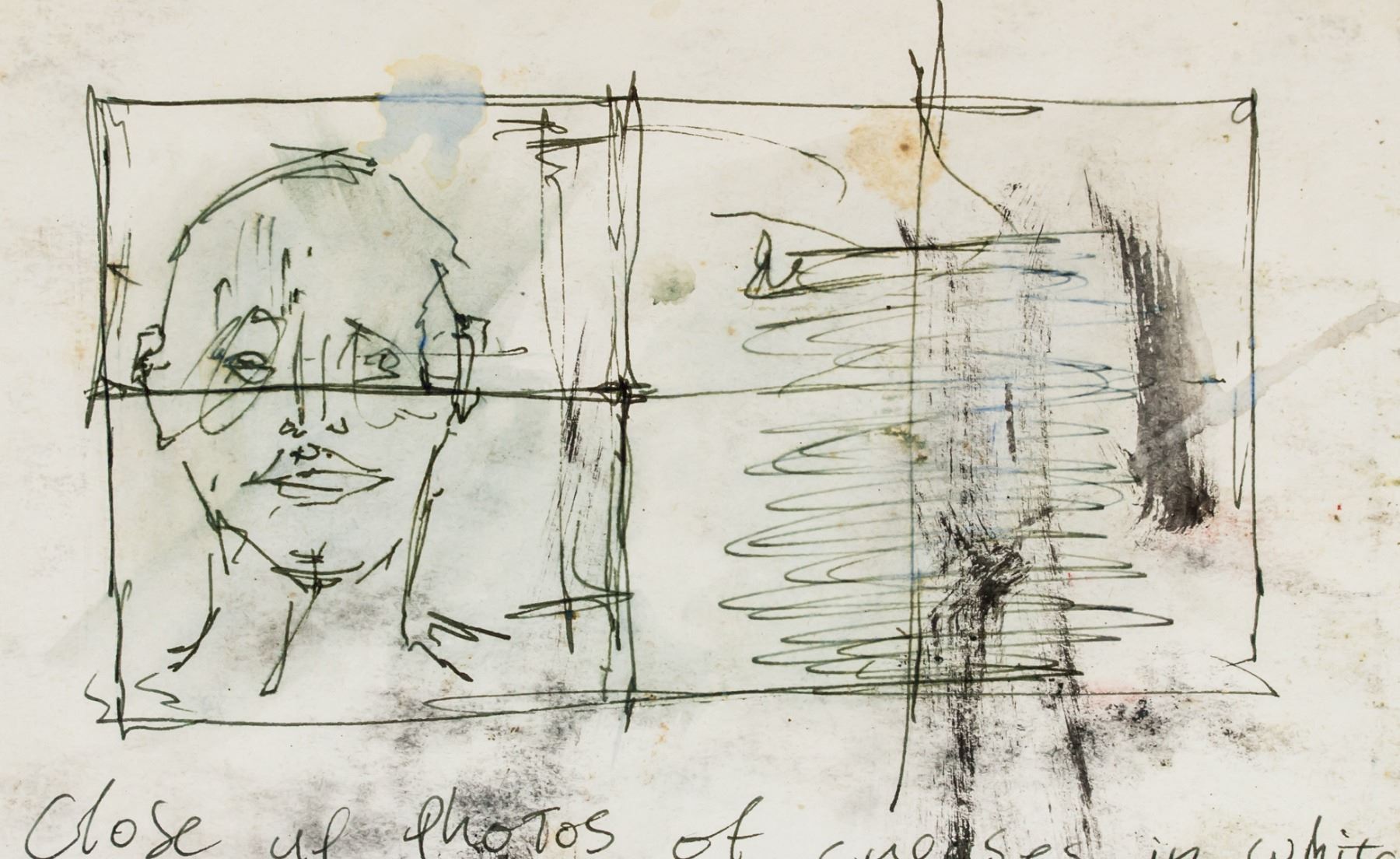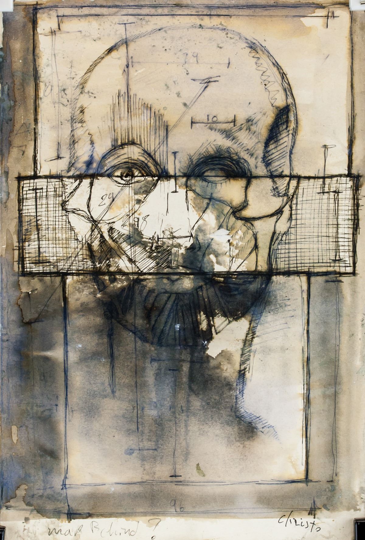 Mixed media on paper. Featuring an anatomical sketch of face. Signed Christo on the lower right corner. Inscribed in pencil on the lower left corner Mal Behind?. Versy inscribed with notes Close up photos of creases in white cloth/material. 29 x 19.5 cm (11.4 x 7.7 inches). PROVENANCE: Southern Ontario estate