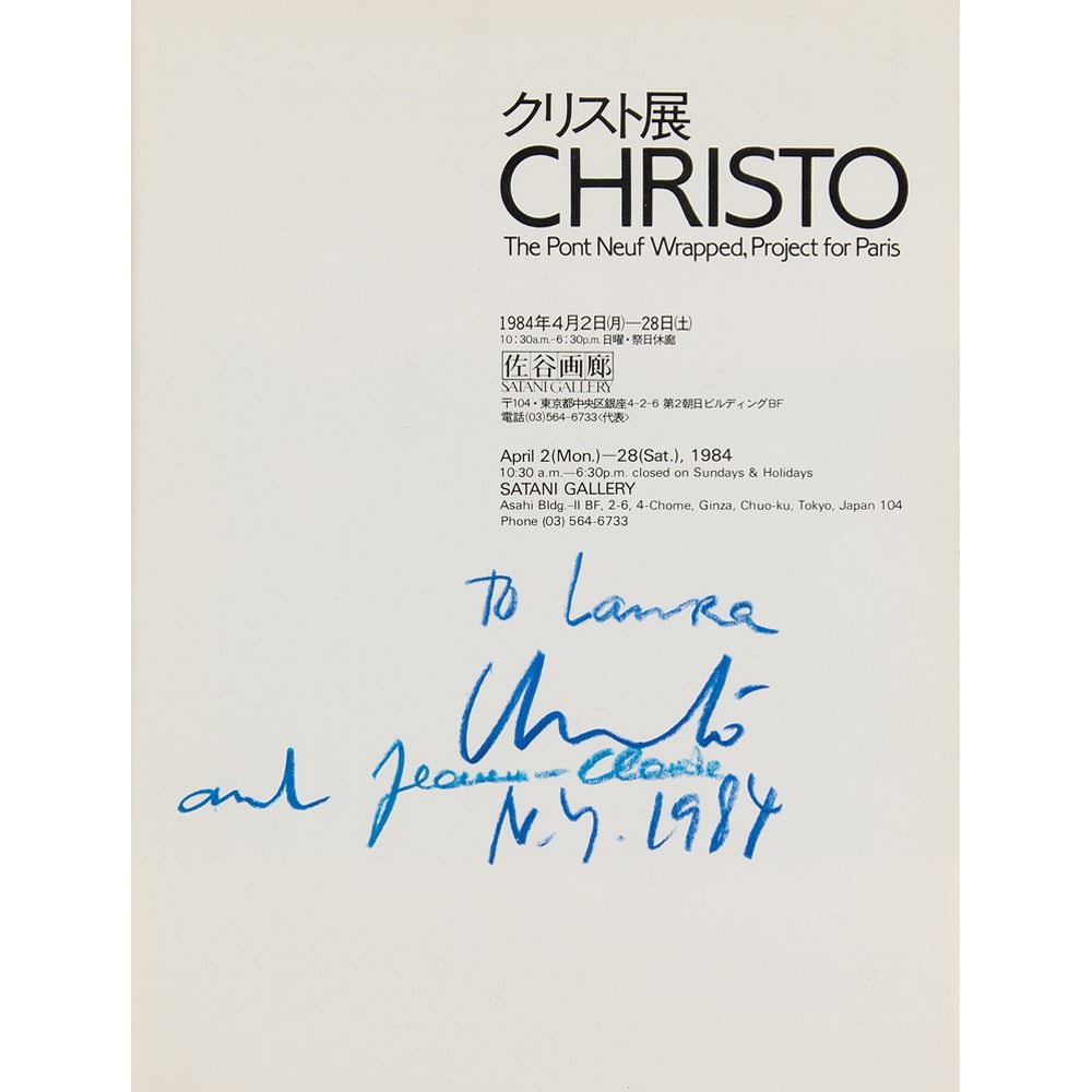 Bilingual English/Japanese exhibition catalog published in 1984 by Satani Gallery, entitled "Christo: The Pont Neuf Wrapped, Project for Paris," 7 x 9.25, signed and inscribed on the title page in blue grease pencil, "To Laura, Christo, 1984," and, "and Jeanne-Claude." In fine condition, with a couple of small affixed ex-collector/library labels.