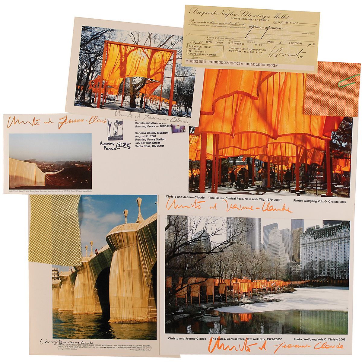 Six items: one rare bank check, 7 x 3.25, filled out in type and signed by Christo, for the amount of one franc from the Pont Neuf art project, October 6, 1985; one commemorative cover, 9.5 x 4, honoring the Running Fence art project, signed by both; one color 7 x 5 cardstock photo of the Gates project signed in pencil by both; one color glossy 7.75 x 9.5 photo of the Pont Neuf, signed by both; and two color 10 x 8 cardstock photos of the Gates, signed in orange artist’s pencil by both. In overall fine condition. Accompanied by two original pieces of the material used in the Pont Neuf and Gates projects.