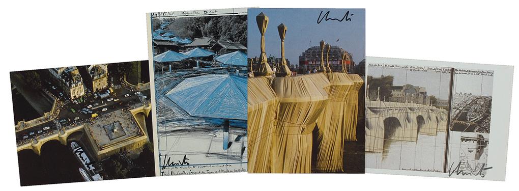 Bulgarian-born artist (born 1935) best known for his ambitious, large-scale “environmental” works that incorporate the wrapping and draping of buildings and natural features in various materials. Four different color postcard photos of Christo’s works, 4.25 x 6 and 6 x 4.25, each signed in black felt tip. In very fine condition.