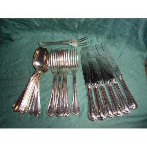 Christofle silverplate flatware: 6 knifes, 6 spoons, 6 forks and 2 serving-forks. The knifes are 24.3 centimeter [9.56 inches] long. The spoons are 20.4 centimeter [8.03 inches] long. The forks are 20.5 centimeter [8.07 inches] long. The serving-forks are 17 centimeter [6.69 inches] long. They have been used, but maybe only at special occasions, because they are in a very good condition. The silverplate is not worn out, it is in a good condition. I think they are from around 1920, maybe older.