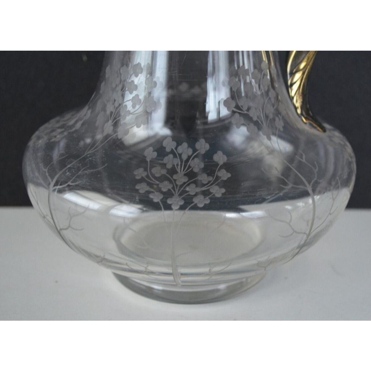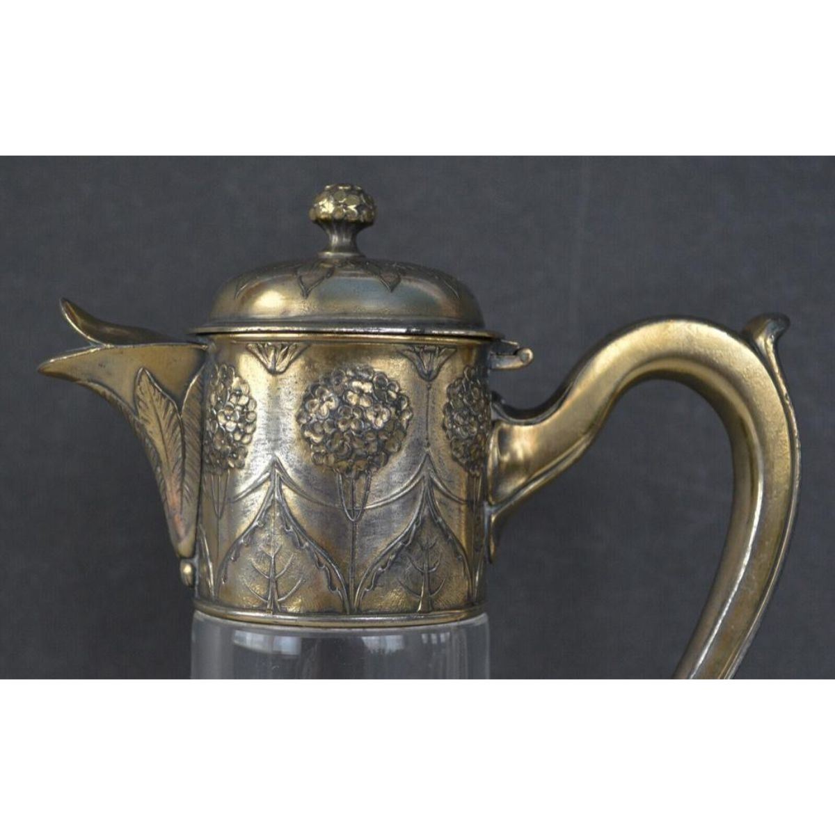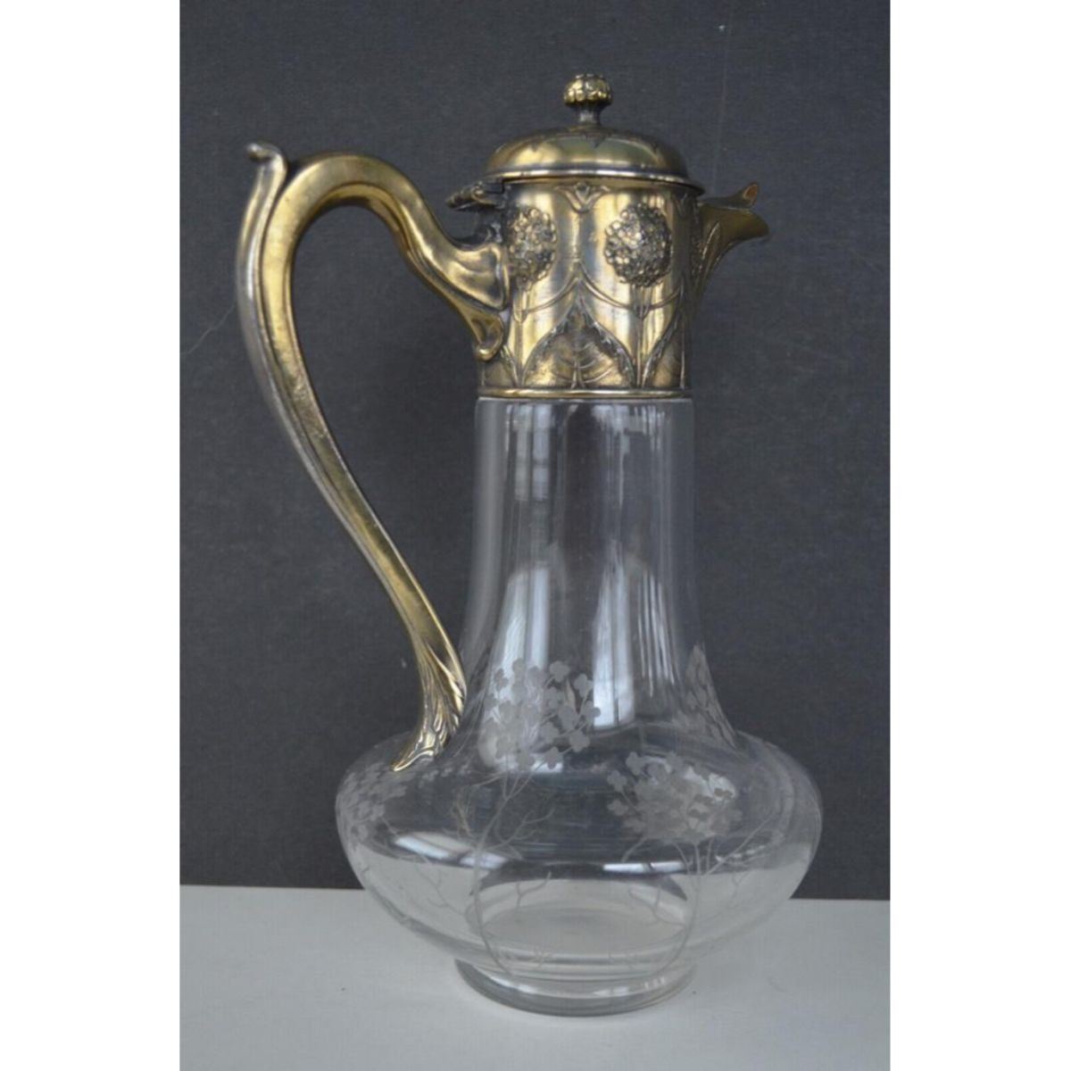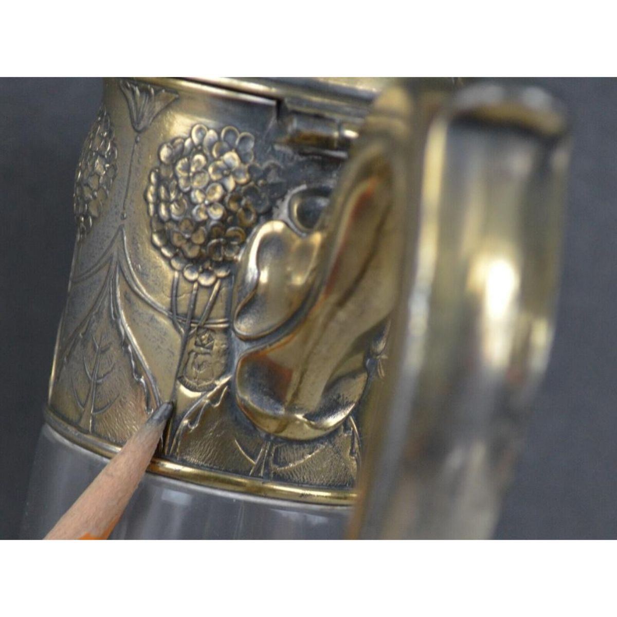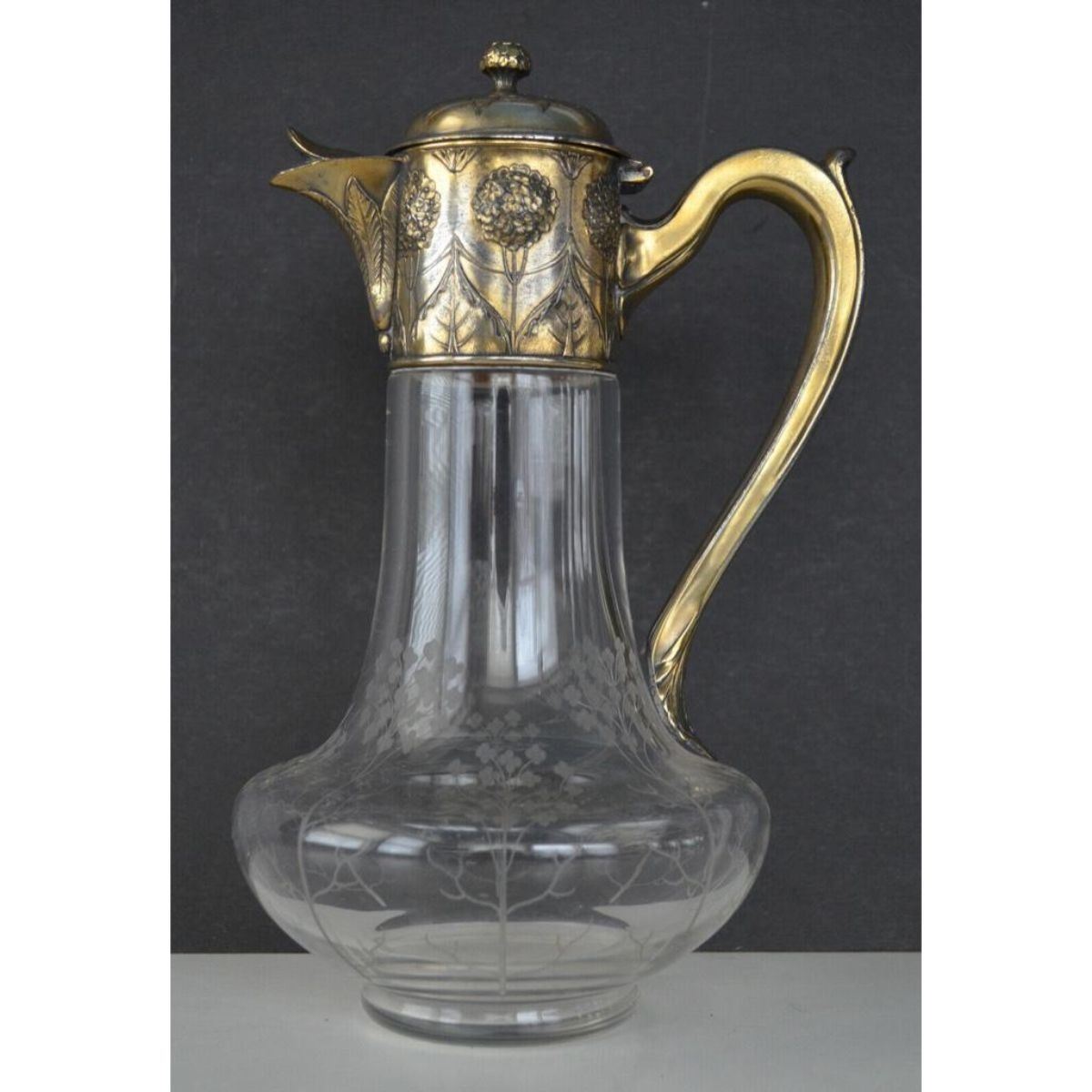 Christofle Gallia French silver-plated claret jug with etched floral design on crystal & embossed floral pattern around the silver diameter & to the lid. Embossed floral pattern knob. The Gallia metalmark of the rooster & goat head stamped near the handle. 9 1/4'' tall to top of lid x 5 1/2'' wide from handle to spout x 2 5/8'' base rim.Â