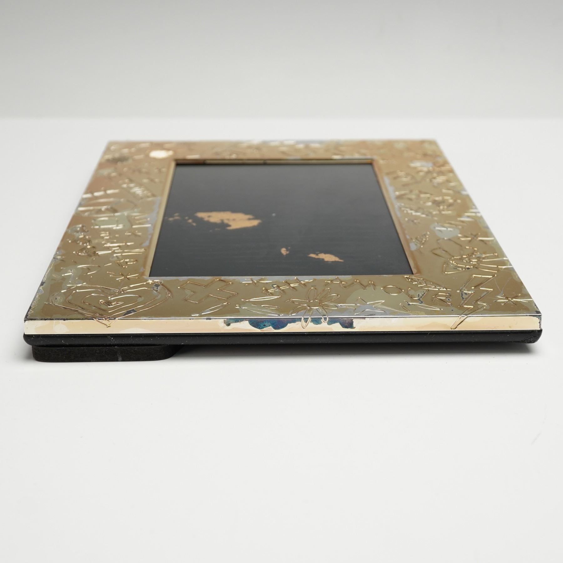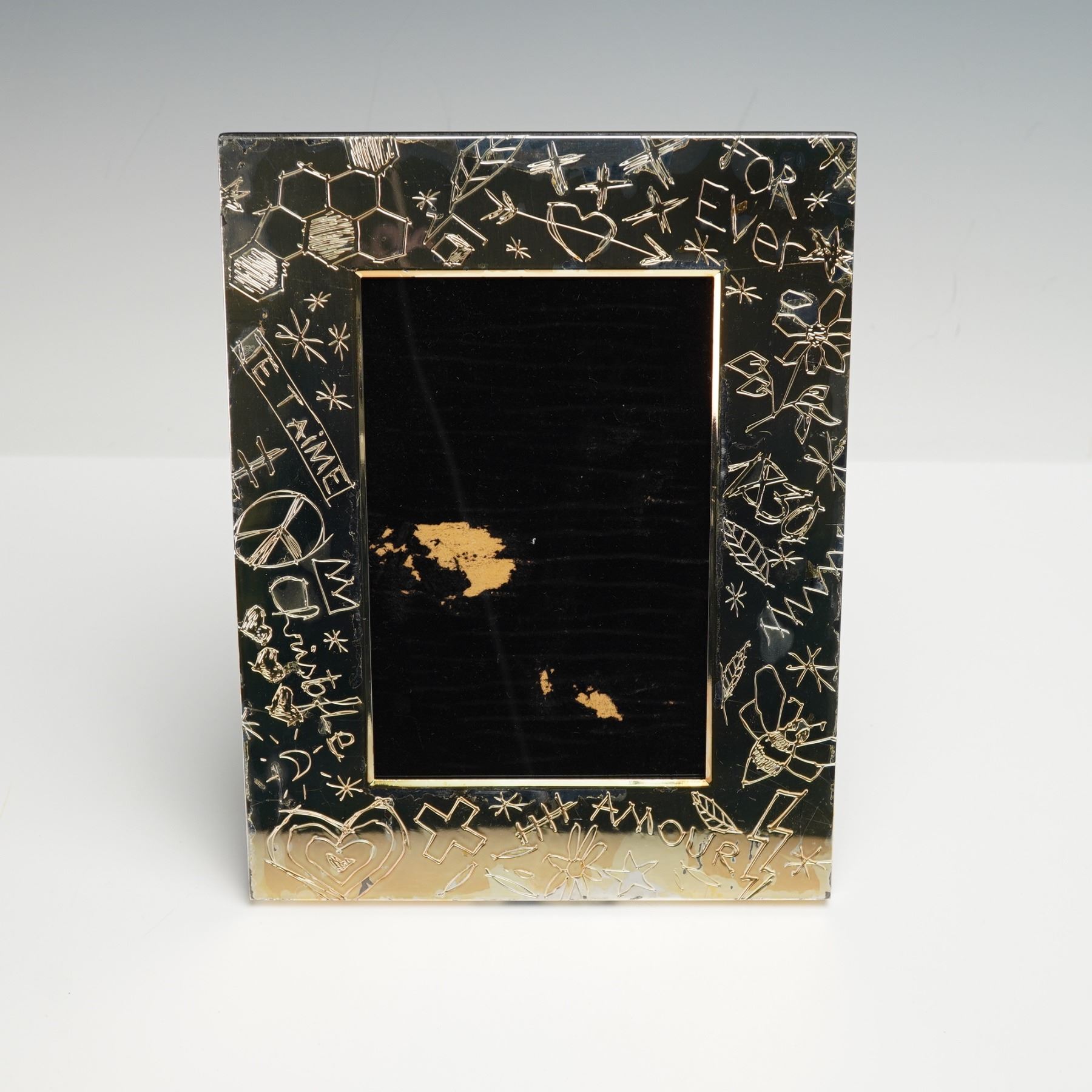 This silverplate picture frame by Christofle Paris features an etched love theme design with symbols such as hearts, stars, flowers, and peace signs, along with French expressions including t'aime and amour. The engraved motifs cover the front surface, giving the frame a distinctive decorative style suitable for presenting a photo.
