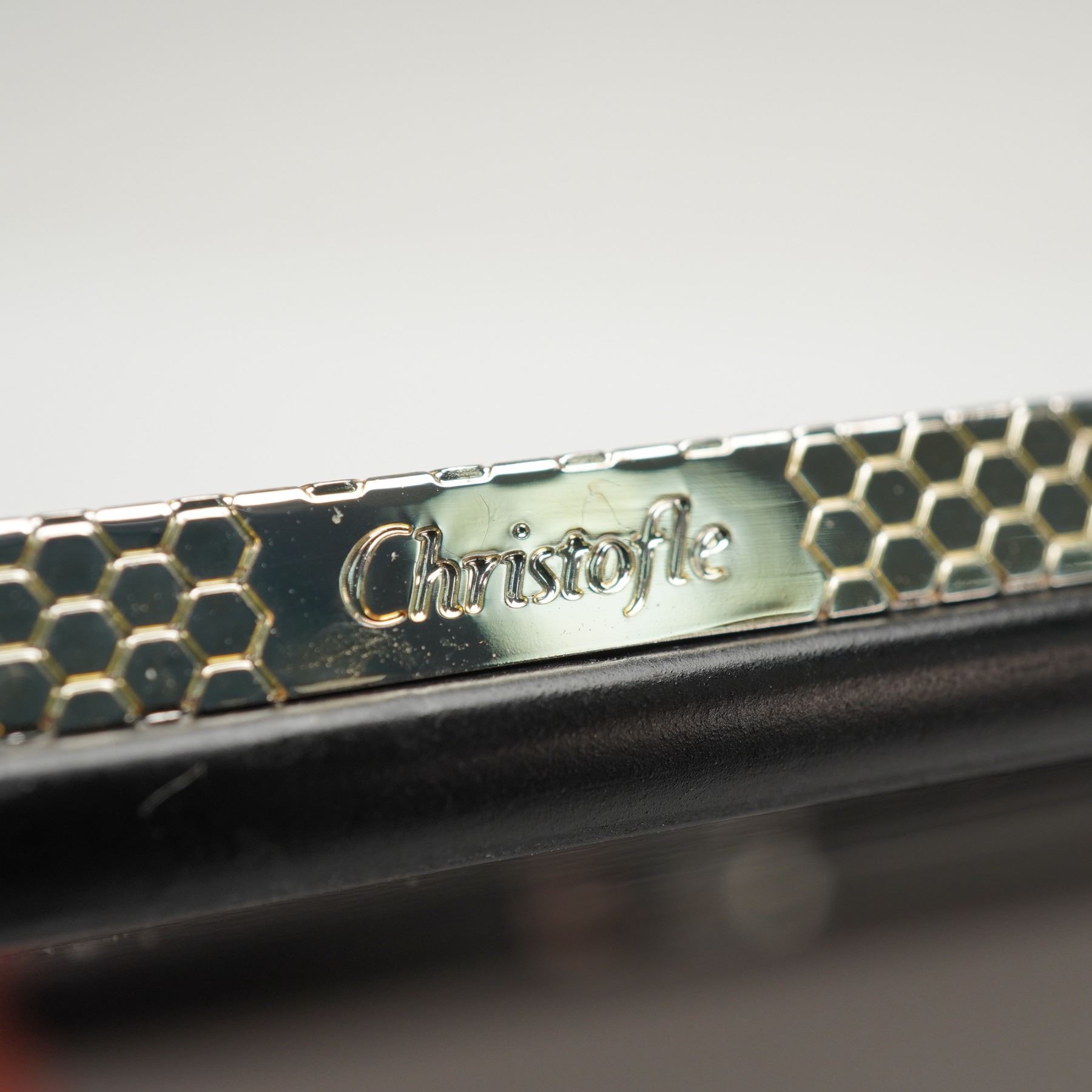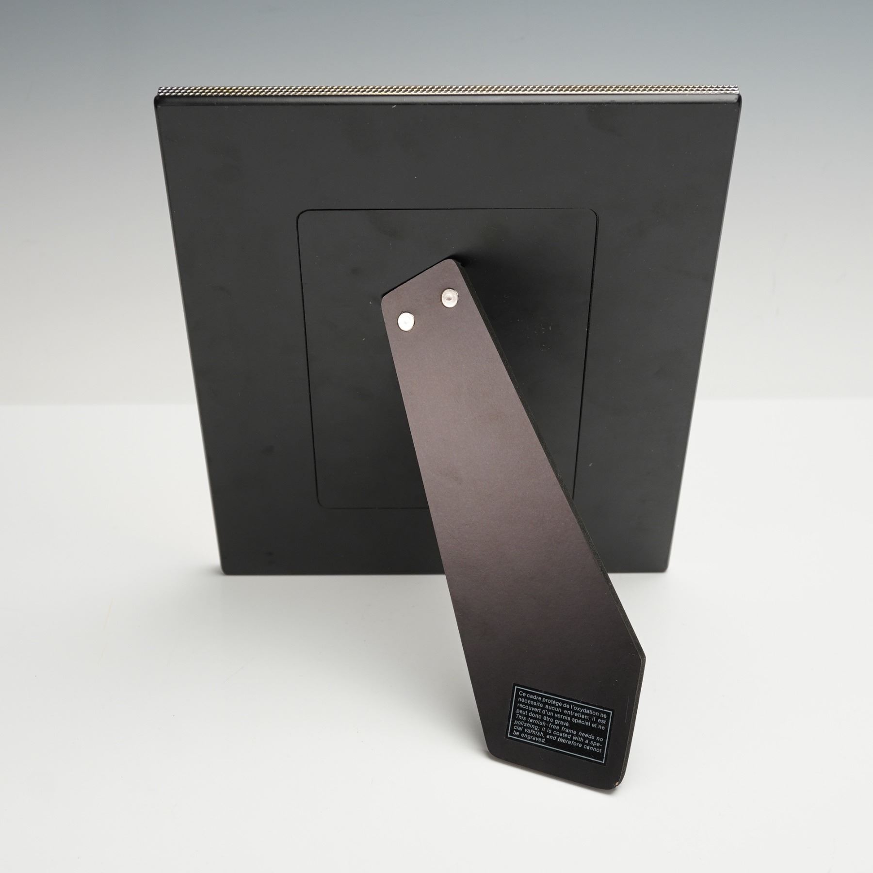 This silverplate picture frame by Christofle Paris features a uniform textured pattern across the front surface, accented by a smooth inner border surrounding the photo opening. The back displays the Christofle emblem.