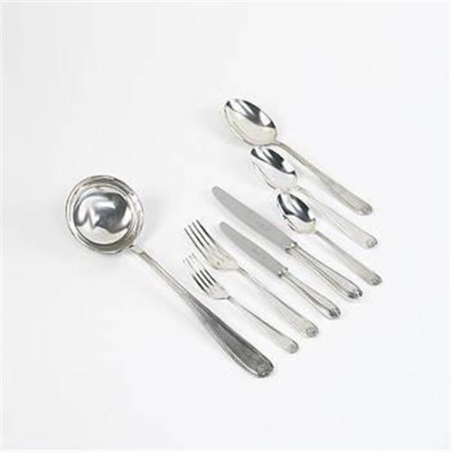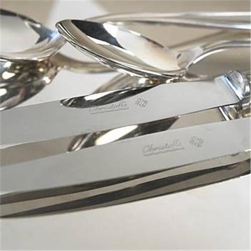 France, 1950s silverplate Complete six piece service for twelve including dinner fork, salad fork, soup spoon, tea spoon, dinner knife, butter knife, one large ladle and one serving spoon. Impressed signature to each element: [Christofle].