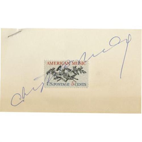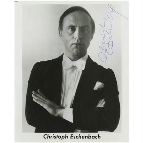 <B>Christoph Eschenbach Autographs.</B></I> A 3" x 5" card, with a five-cent commemorative postage stamp affixed, signed by the celebrated pianist/conductor in blue ink. Eschenbach's autograph extends across the face of the stamp and is large and clean. Accompanying the lot is a b&w 8" x 10" of Eschenbach, signed by him in blue ballpoint. In Very Good condition with moderate age-toning along base of card and a staple attached to upper left corner.<BR><BR><b>Shipping:</b> Flat Material, Small (<a target="_blank" href="http://www.heritageauctions.com/common/shipping.php">view shipping information</a>)