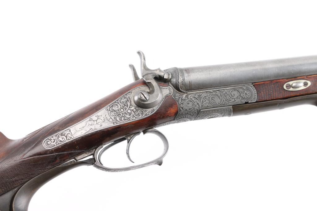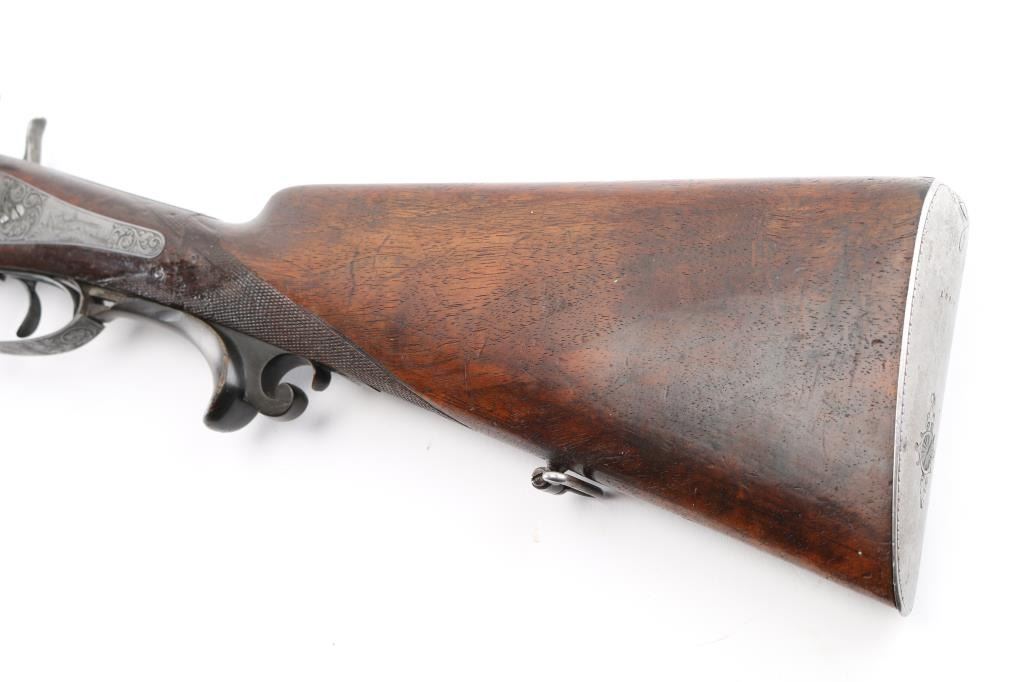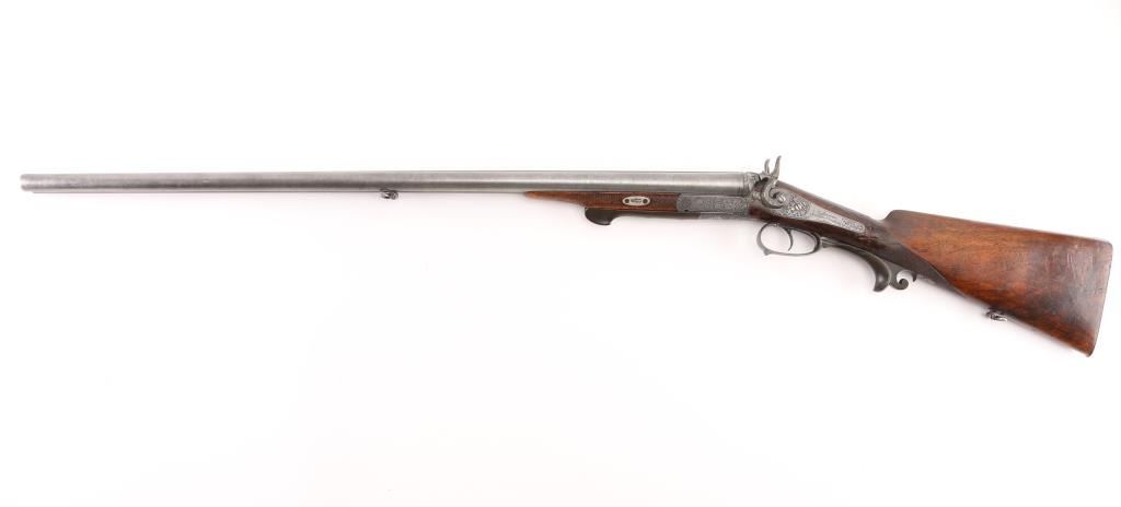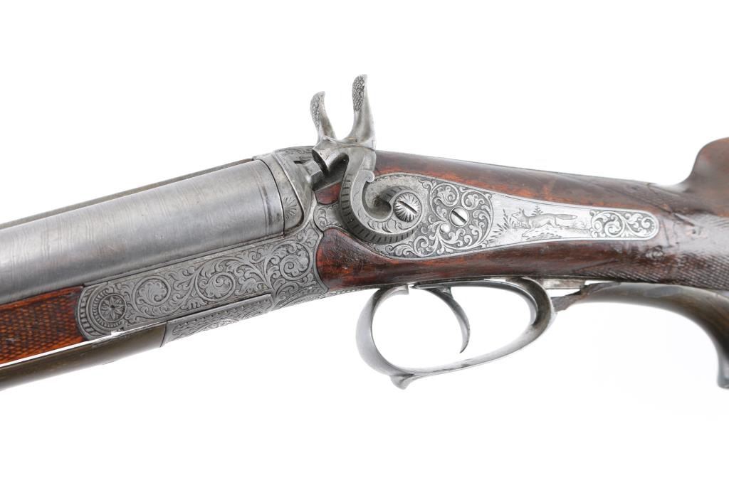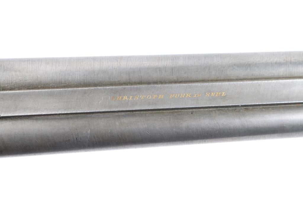 Pre war engraved Lefaucheux system hammer gun made by Christoph Funk in Suhl, Germany. (1835-1965) Funk guns are considered by many to be "The Mercedes in gun craftsmanship". Featuring 29 1/2" Damascus Barrels, English style stock with checkered wrist & forearm. Buffalo horn bottom lever. The grip appears to be carved ebony featuring a nice forward curling rear grip flourish. "Christoph Funk in Suhl" inlayed in gold on the lower barrel rib. Sling swivels. The side plates, hammers, triggerguard & action have a pewter gray finish, the action, triggerguard & plates are beautifully engraved with tight flowing scrolls with game scenes on the triggerguard, and each side plates. Two cock hammer actions are crisp/tight, barrels lock-up tight, bores are good overall with some pitting above the chambers, there are two chips out of the forward grip, and two hairline cracks below the upper tang, still is very sound. LOP is 13 3/4".Chokes measure IC (R), CYL (L). NRA Condition-Fair. C&R Firearm.