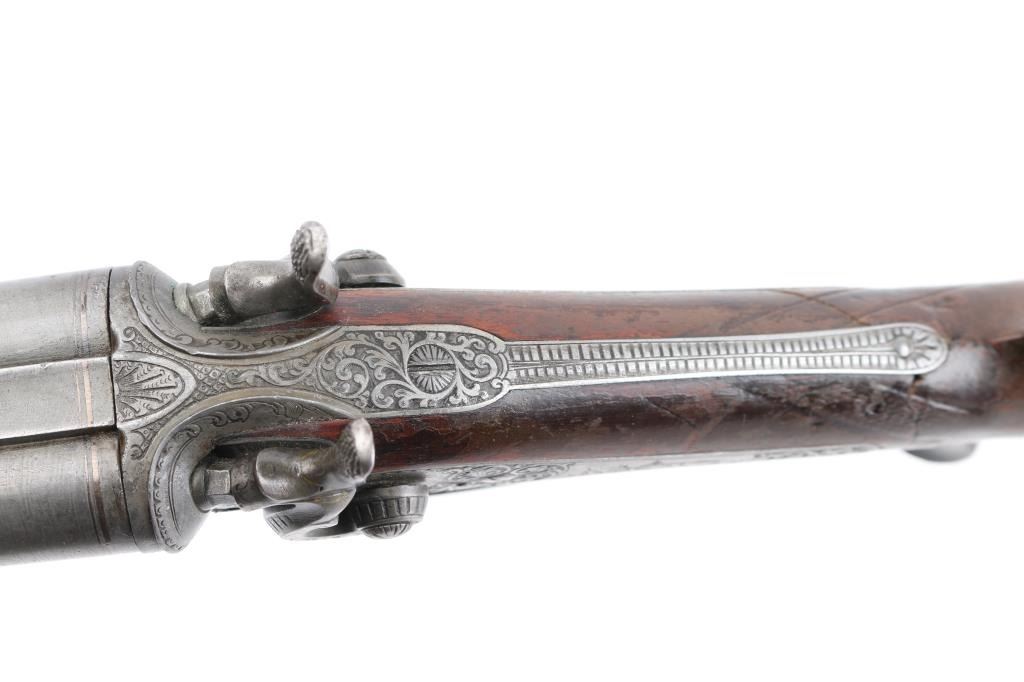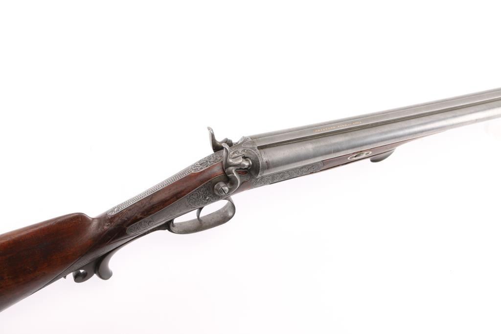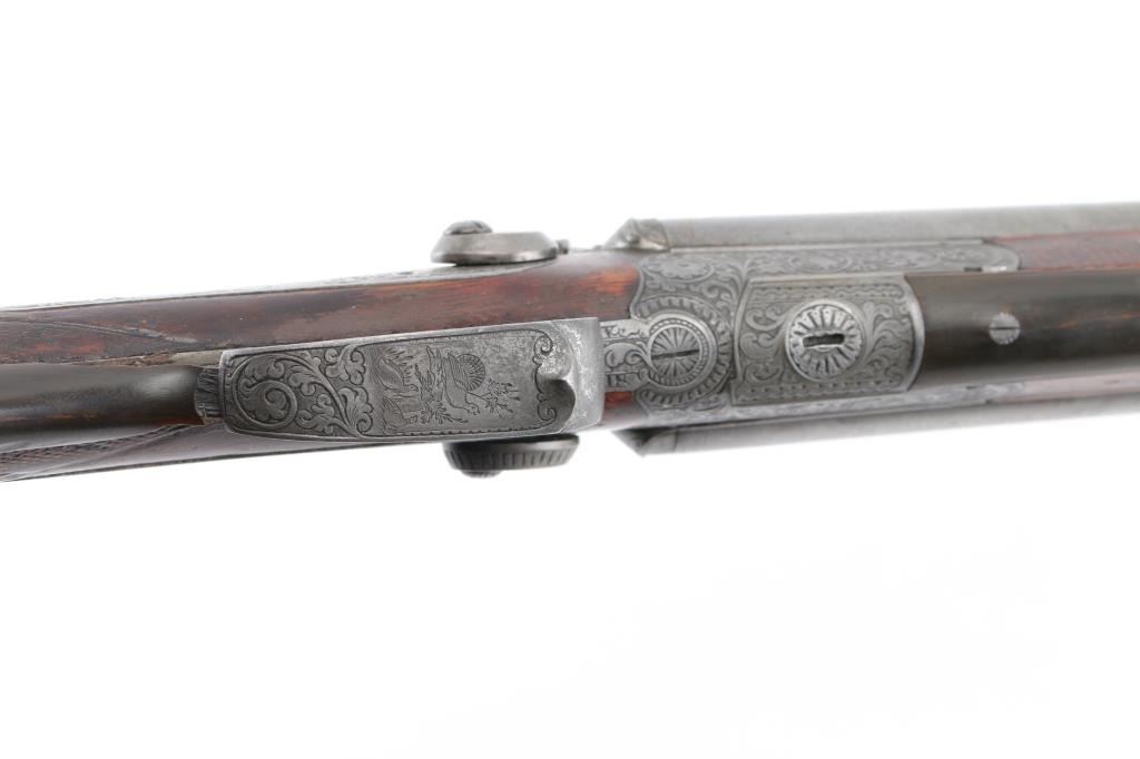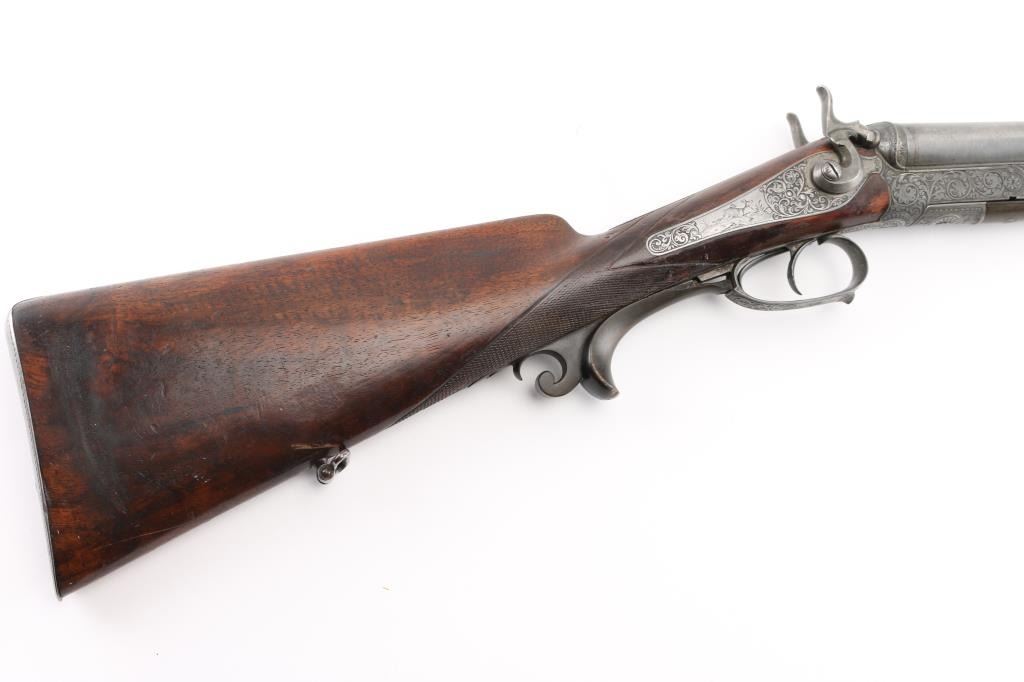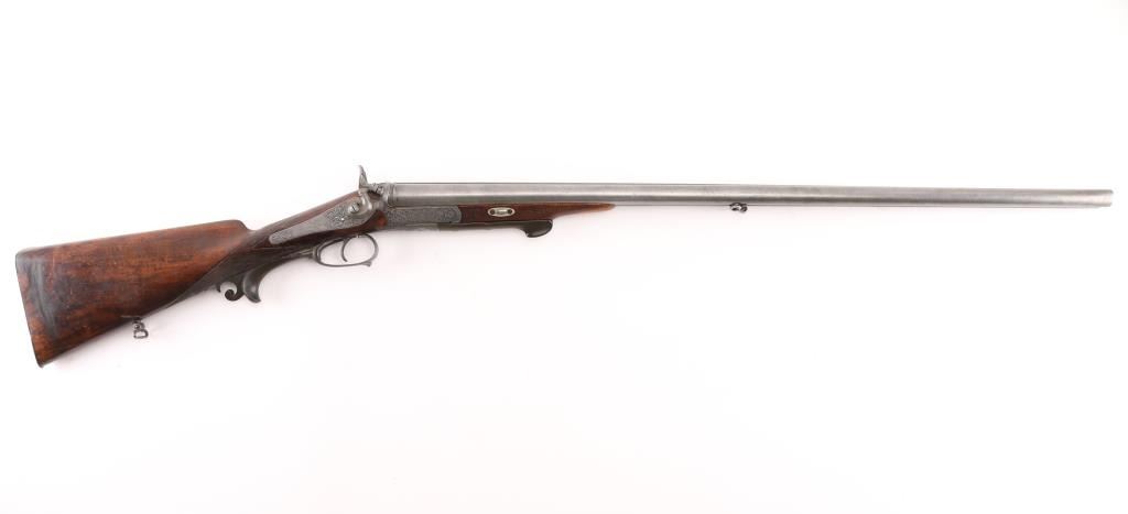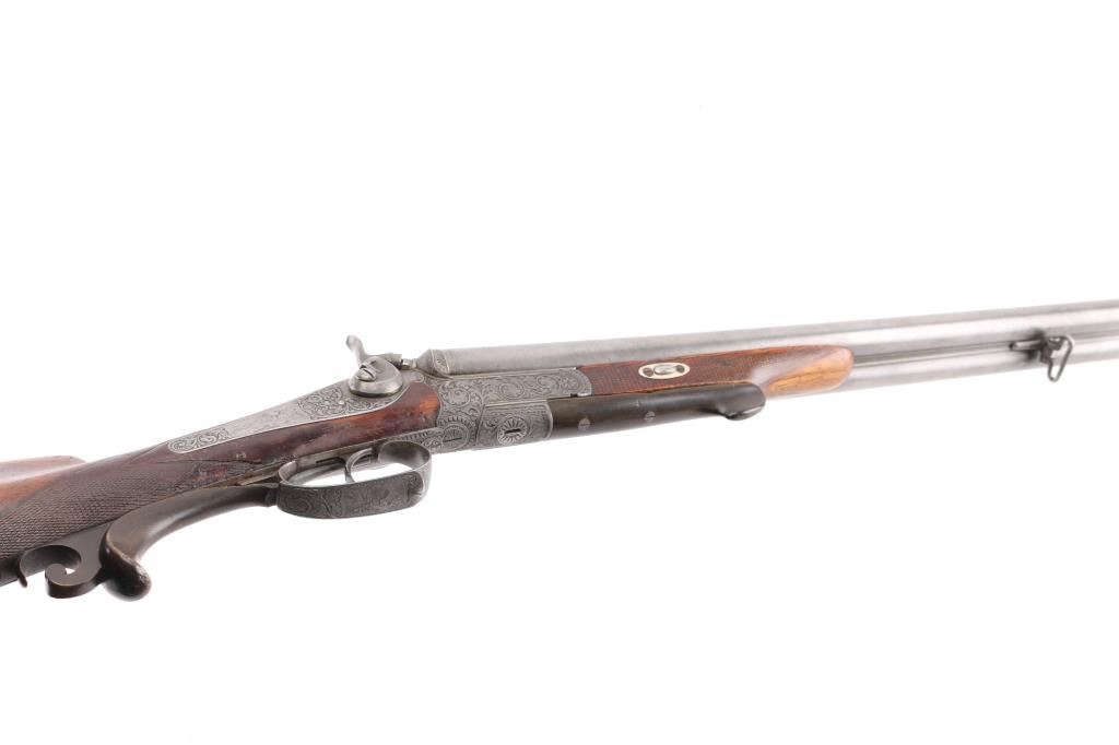 Pre war engraved Lefaucheux system hammer gun made by Christoph Funk in Suhl, Germany. (1835-1965) Funk guns are considered by many to be "The Mercedes in gun craftsmanship". Featuring 29 1/2" Damascus Barrels, English style stock with checkered wrist & forearm. Buffalo horn bottom lever. The grip appears to be carved ebony featuring a nice forward curling rear grip flourish. "Christoph Funk in Suhl" inlayed in gold on the lower barrel rib. Sling swivels. The side plates, hammers, triggerguard & action have a pewter gray finish, the action, triggerguard & plates are beautifully engraved with tight flowing scrolls with game scenes on the triggerguard, and each side plates. Two cock hammer actions are crisp/tight, barrels lock-up tight, bores are good overall with some pitting above the chambers, there are two chips out of the forward grip, and two hairline cracks below the upper tang, still is very sound. LOP is 13 3/4".Chokes measure IC (R), CYL (L). NRA Condition-Fair. C&R Firearm.