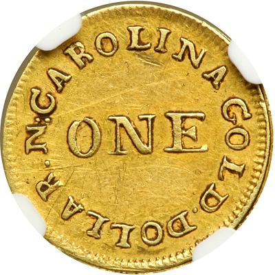 Christopher Bechtler, ONE DOLLAR N. CAROLINA, 30 gr. Star. NGC graded XF Details, scratches. Lightly toned and overall, quite a decent example. Popular and always in demand as the first gold dollar produced in the United States from natively mined ore.