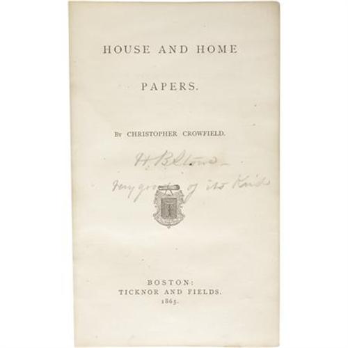 <B>Christopher Crowfield [pseudonym for Harriet Beecher Stowe]. </B></I><B><I>House and Home Papers</B></I></B></I><B>. </B></I>Boston: Ticknor and Fields, 1865.<BR> <BR>First edition, first issue. Twelvemo. 333 pages.<BR><BR>Original green cloth with decoration stamped in blind on the boards and titles stamped in gilt on the spine. Significant shelf wear to boards with nicking, spotting and wrinkling in spots and a slight warp to boards. Contents toned with some soiling and chipping to pages. Good condition.<BR><BR><BR><b>Shipping:</b> Books & Catalogs (<a target="_blank" href="http://www.heritageauctions.com/common/shipping.php">view shipping information</a>)