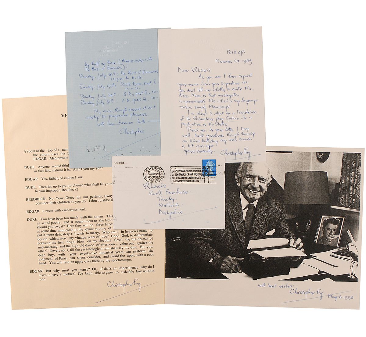 British playwright (1907-2005) remembered for his 1948 romantic comedy The Lady's Not for Burning. Four items: two ALSs (one with original mailing envelope), one signed “Christopher,” the other signed in full, talking about working on Sister Dora and a translation of Giraudoux’s Ondine; one souvenir script page from Venus Observed; and a photocopied photo, each signed in blue ballpoint. In fine condition.