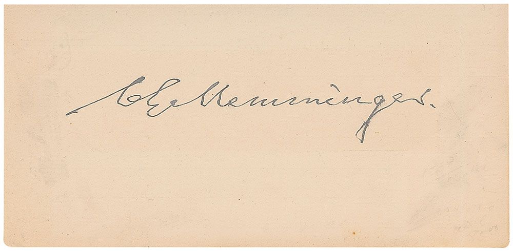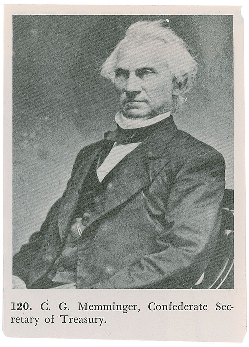 Politician (1803–1888) who served as the first secretary of the treasury for the Confederate States of America. Ink signature, “C. G. Memminger,” on an off-white 5.5 x 2.75 slip. A subtle block of toning over the signature from previous display, slight sh