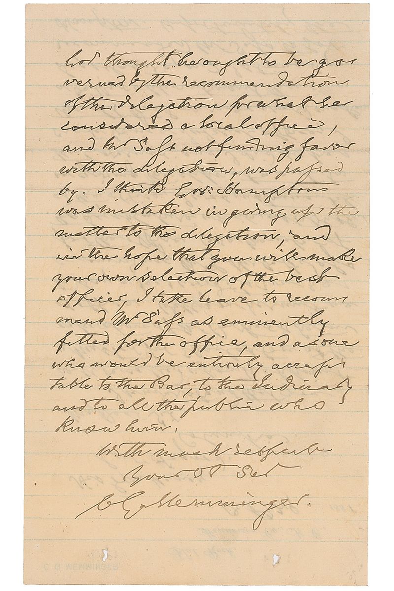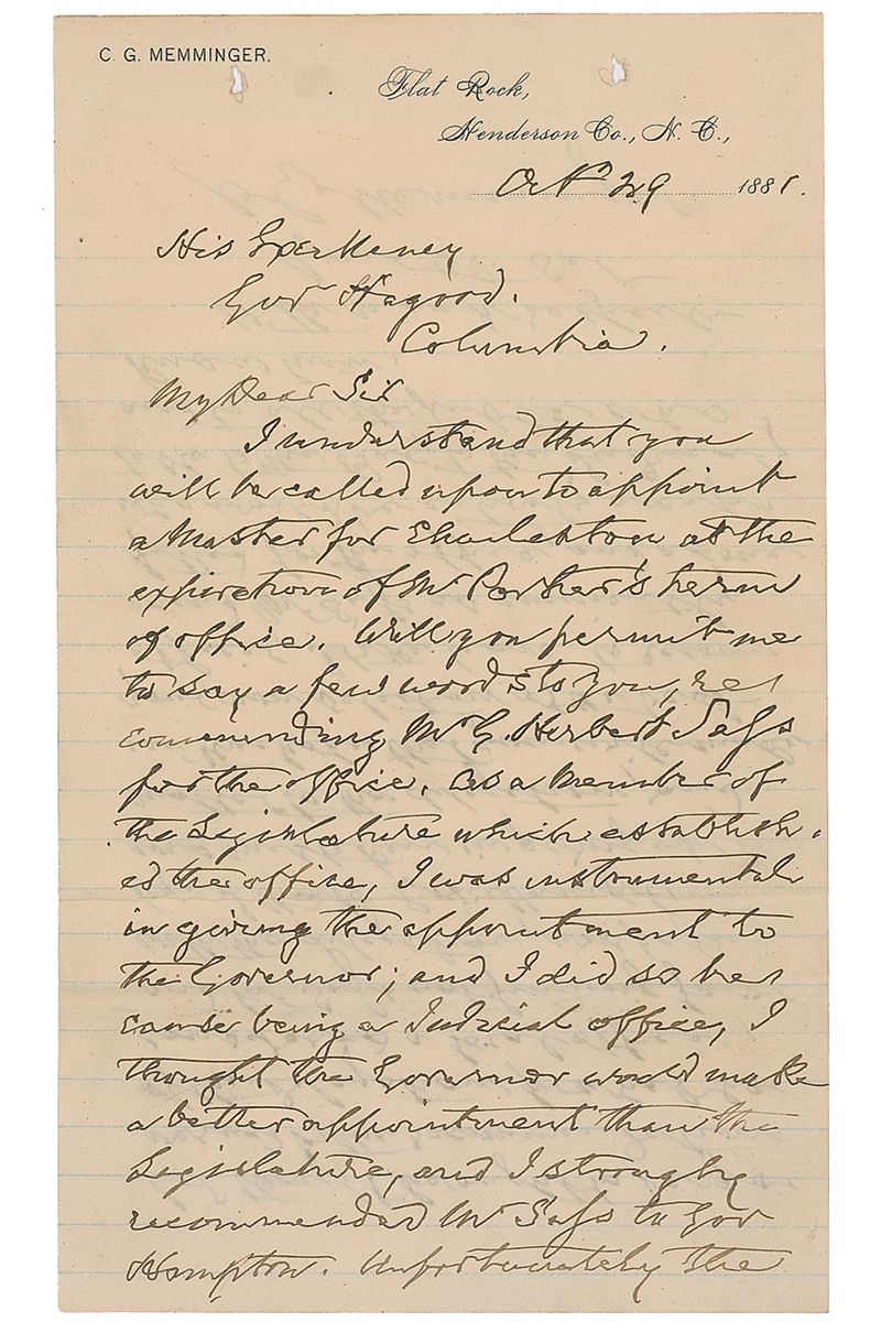 Politician (1803–1888) who served as the first secretary of the treasury for the Confederate States of America. ALS signed “C. G. Memminger,” one page, lightly-lined both sides, 5.5 x 9.25, personal letterhead, October 29, 1881. Letter to Governor Johnson Hagood of South Carolina. In part: “I understand that you will be called upon to appoint a Master for Charleston…I take leave to recommend Mr. Sass as eminently fitted for the office.” In fine condition, with a pair of small filing holes at the top. The gentleman recommended, George Herbert Sass, was appointed a ‘Master in Equity’ in 1883, an office in which he served throughout his life.