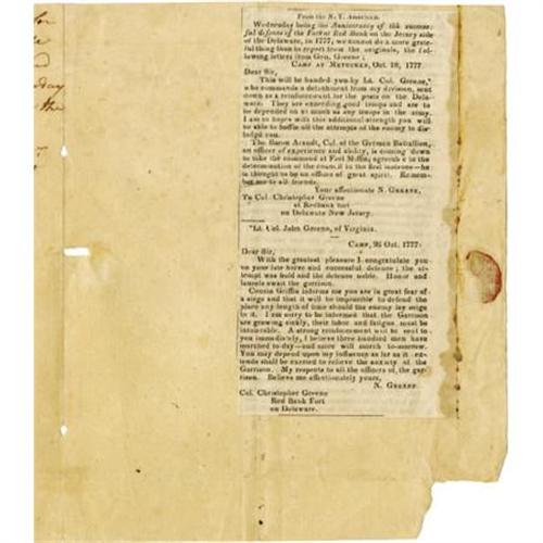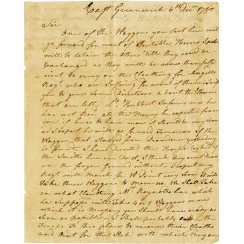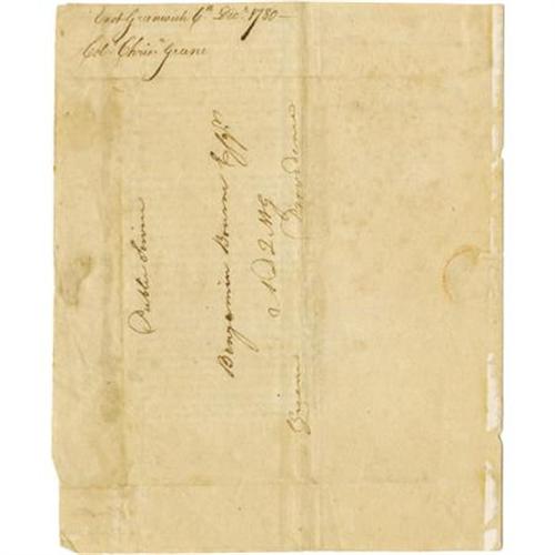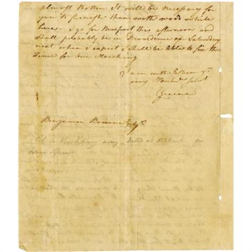 <B>Christopher Greene Autograph Letter Signed</B></I> <B>“<I>C Greene,</B></I>”</B></I> two pages, 5.75” x 7”, front and verso. East Greenwich, December 6, 1780. Integral leaf addressed by Greene to “<I>Benjamin Bourne Esqr/AD QMG/Providence,” “Public Service</B></I>” above addressee, franked “<I>C Greene</B></I>” to the lower left. In part, “<I>One of the Waggons you sent here can't go forward for want of Suitable Horses. I ask will to detain the others till they cou'd be Exchanged as they will be more than sufficient to carry on the cloathing for Angells Regt who are suffering for want of them. I wish you to give some directions about the Horses that are left…I expect my Regt will march for W Point very soon. It will take three Waggons to move us…I go to Newport this afternoon and shall probably be in Providence on Saturday next when I expect I shall be able to fix the time four our marching.</B></I>” Ensign Benjamin Bourne became Quarter Master of the 2nd Rhode Island Regiment in 1776. He was Rhode Island's first Congressman (1790-1796), later serving as a federal judge. Christopher Greene, a cousin of General Nathaniel Greene, had been captured in Quebec in 1775 and exchanged in 1777. In the Battle of Newport (1778), he commanded a regiment of former slaves freed to serve in the Army. On May 14, 1781, Col. Christopher Greene was killed at the Battle of Croton River. The integral address leaf is torn at the seal and two small printed letters to the colonel from Nathaniel Greene have been affixed on its blank verso. The letter itself has folds and is in fine condition. Christopher Greene is scarce in any form. This is a particularly good letter with Revolutionary War content.<BR><BR><b>Shipping:</b> Flat Material, Small (<a target="_blank" href="http://www.heritageauctions.com/common/shipping.php">view shipping information</a>)