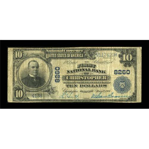 <B>Christopher, IL</B></I> - $10 1902 Plain Back Fr. 625 <B>The First NB</B></I> Ch. # 8260<BR> A very scarce bank in large size, with the census from here standing at just four pieces. This example is new to the census, and is just a bit lower grade than the note from here we sold in our last sale which fetched a winning bid of $2300. <B>Very Good-Fine, </B></I>with sea-green pen signatures of F.G. Litt, A. Cashier, and Nelson Browning.<BR><BR><b>Shipping:</b> Coins & Currency (<a target="_blank" href="http://www.heritageauctions.com/common/shipping.php">view shipping information</a>)
