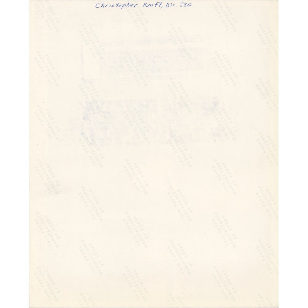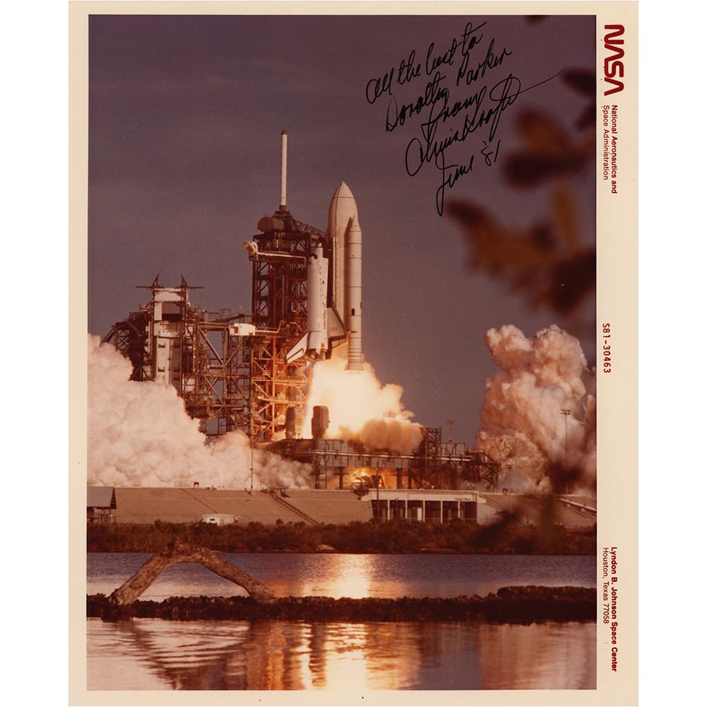 Official color semi-glossy 8 x 10 red-numbered NASA photo (S81-30463) of the launch of the STS-1 mission on April 12, 1981, signed and inscribed in black felt tip, "All the best for Dorothy Parker, from, Chris Kraft, June '81.†Reverse bears "This Paper Manufactured by Kodak" watermarks. In fine condition.